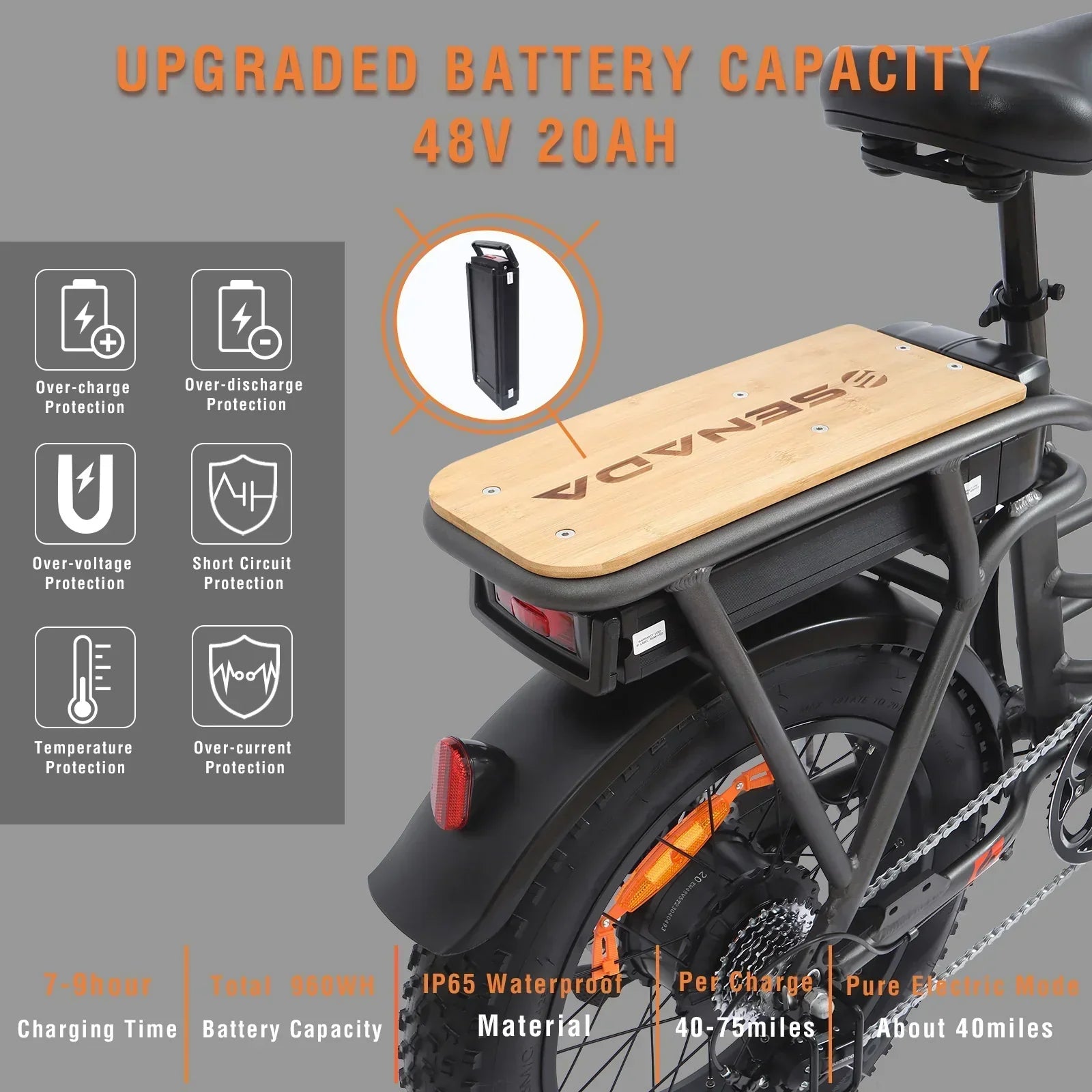 Battery | 48V 20Ah Li-ion battery, IP65 waterproof (included) |