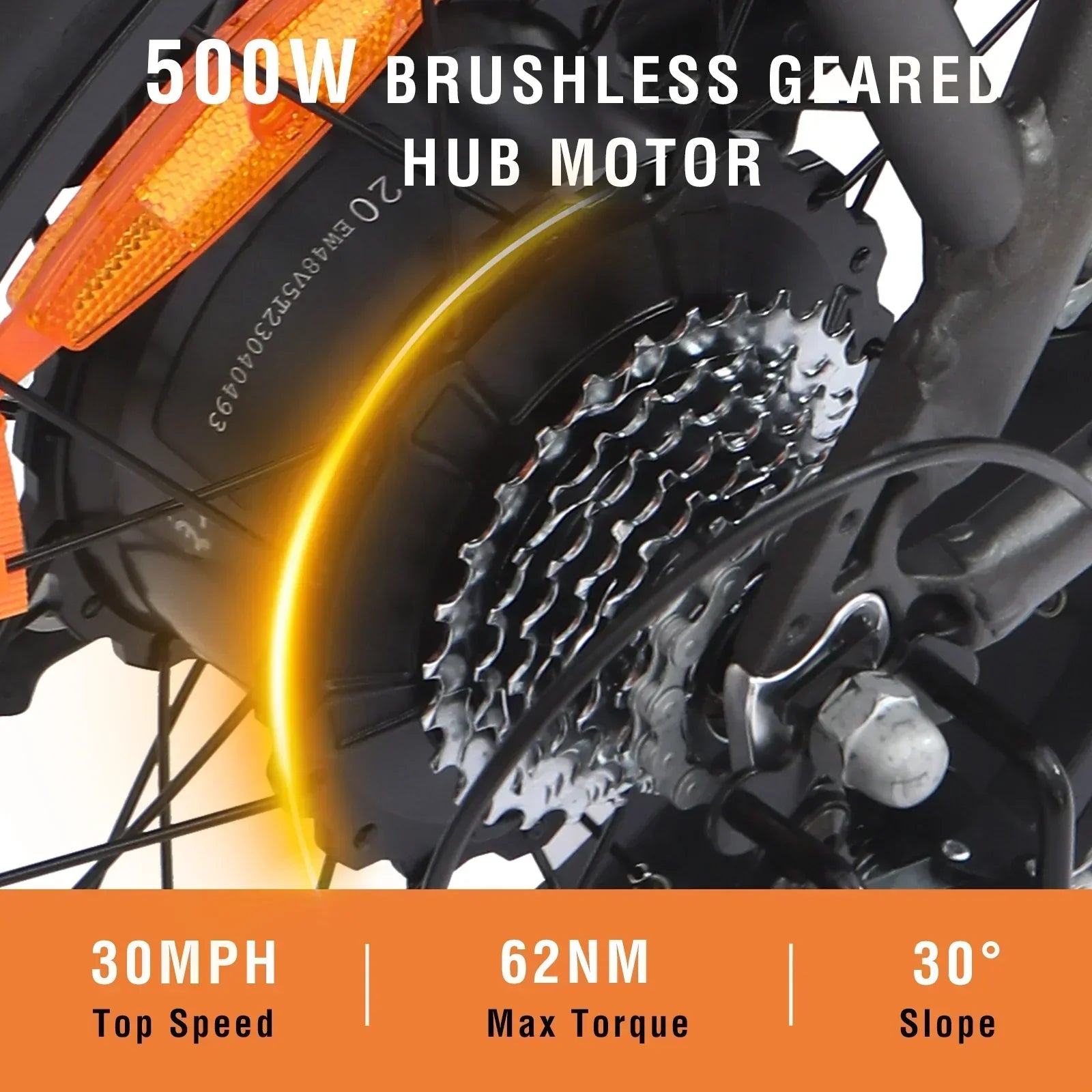 Motor | 500W (700W peak) toothed brushless hub motor, 62 N·m torque |