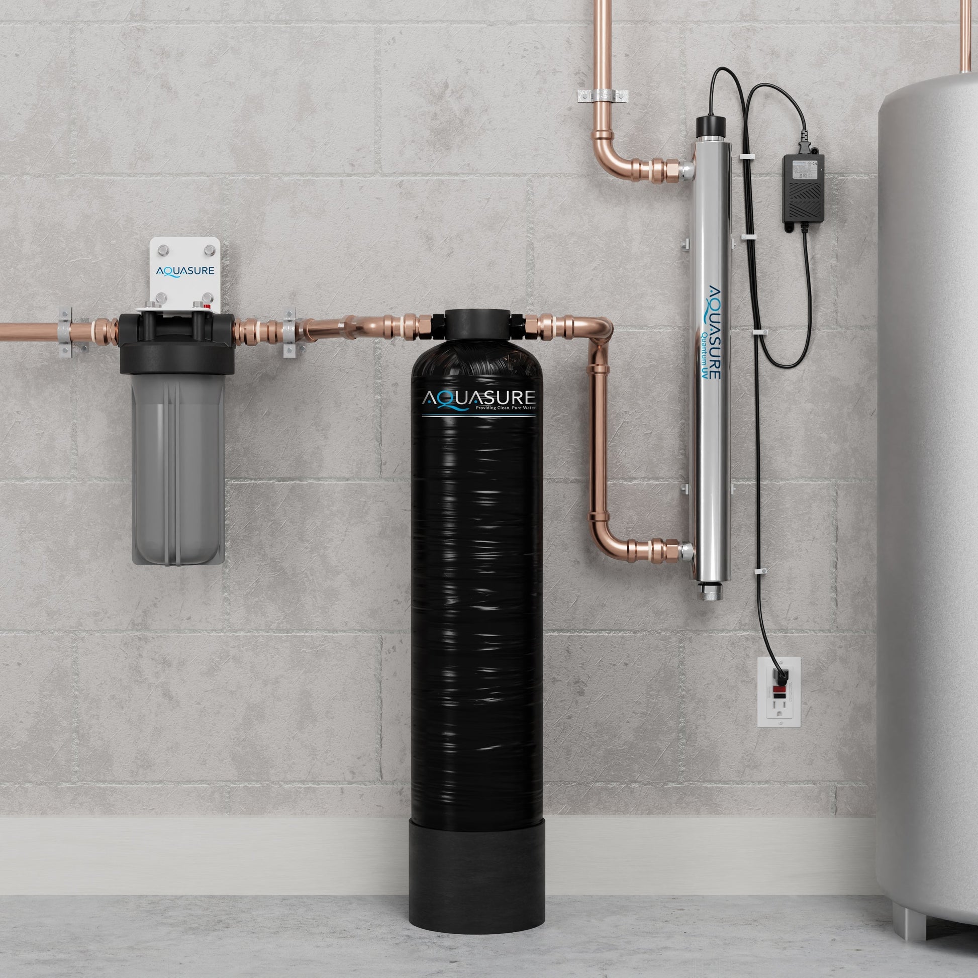 The Aquasure Serene Series Whole House Water Conditioning Descaler System is an alternative solution for improving your water quality without the hassle of salt replacements. Designed for homes with 1 to 3 bathrooms, this compact system delivers salt-free water to your entire home and protects your plumbing and appliances from scale build-up. This 3-in-1 bundle removes 99% of contaminants such as sediment, chemicals, VOCs, and much more. Give yourself the peace of mind you deserve - transform your home with clean, healthy, safe water while embracing a maintenance-free lifestyle with Aquasure.
