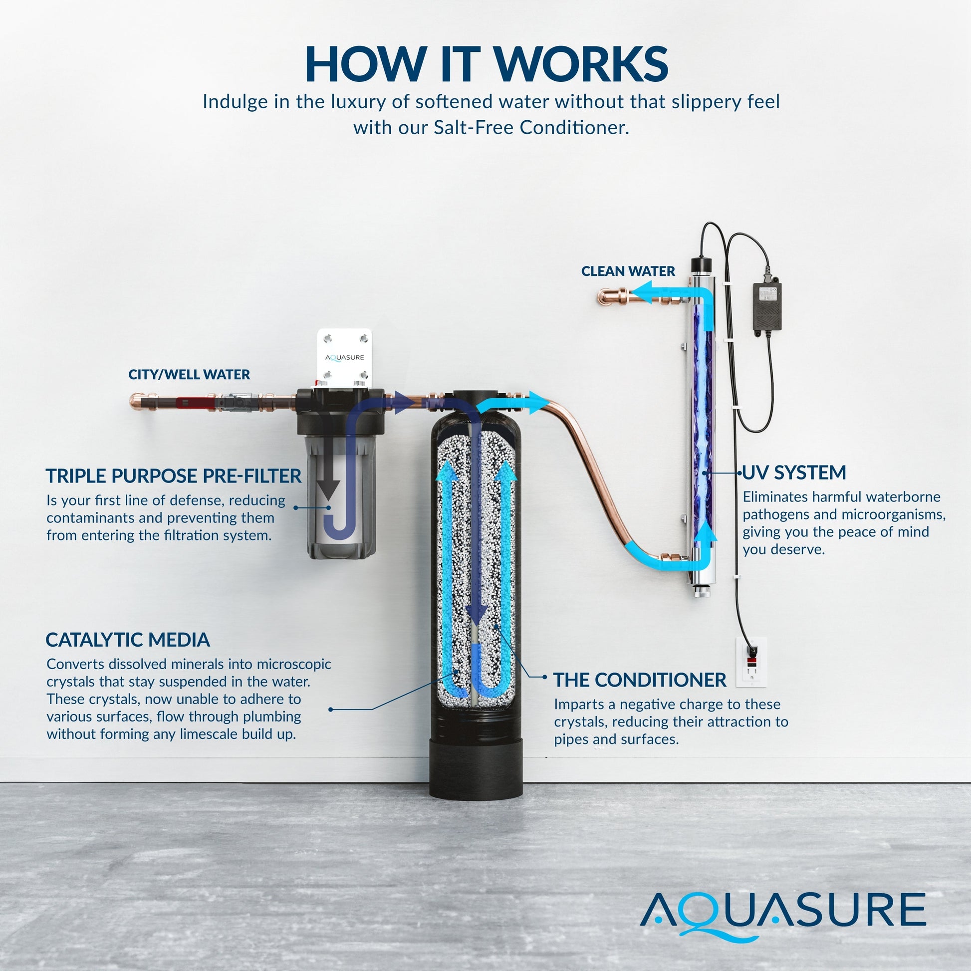 A: The system uses a salt-free descaling process to condition water, preventing scale buildup on pipes and appliances, without the need for traditional salt, making it an eco-friendly alternative to water softening.