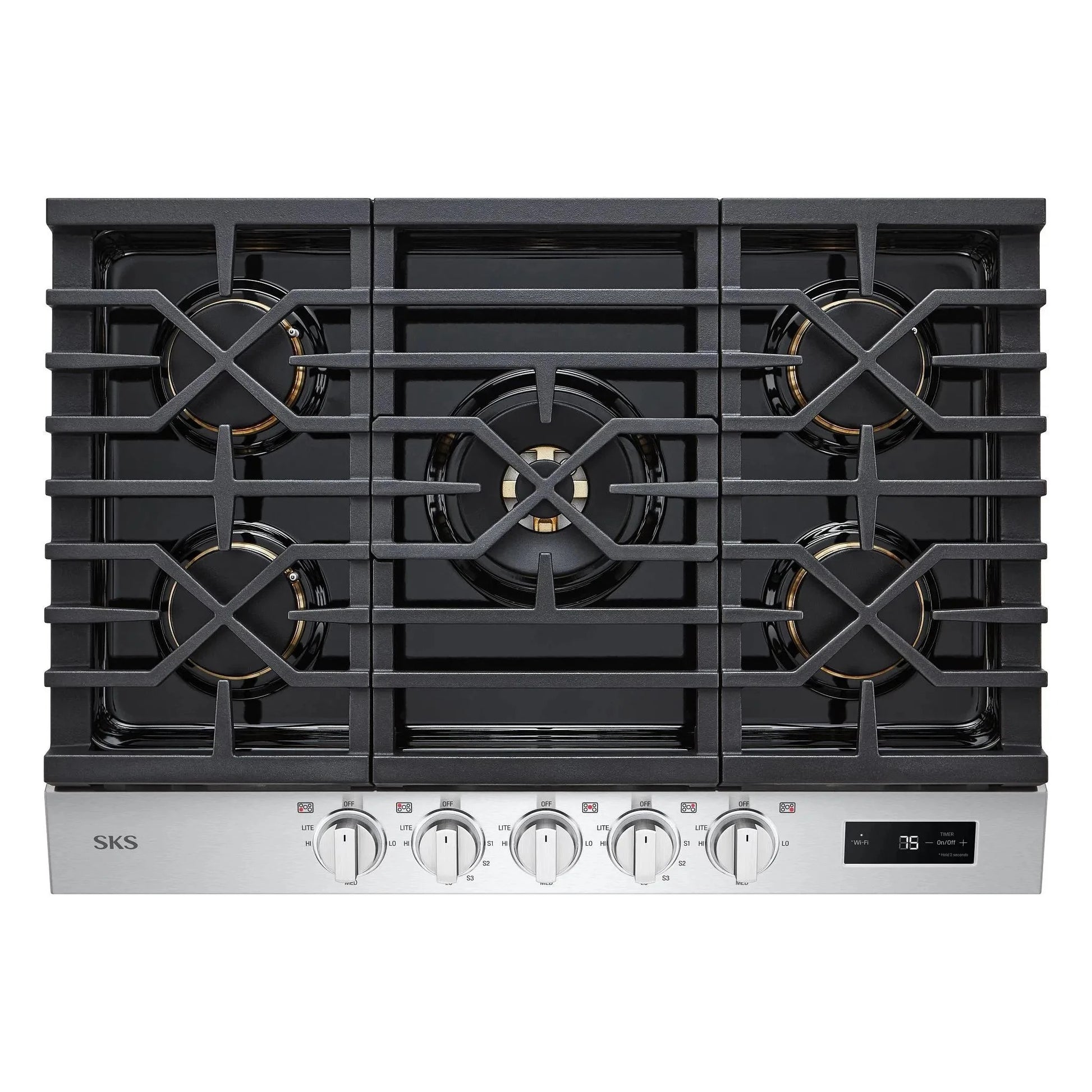 The brand SKS SKSGT3054S is an advanced 30‑inch smart gas cooktop engineered for connected kitchens. It includes five sealed burners ranging from powerful high-BTU outputs to low simmer settings, supported by continuous cast‑iron grates for smooth cookware movement. Integrated sensors monitor flame intensity and automatically send alerts via Wi‑Fi to your smartphone, promoting safety and control. Front-located control knobs with vertical digital displays offer intuitive operation. The stainless steel surface is easy to clean, making it a high-tech yet practical addition to modern kitchens.