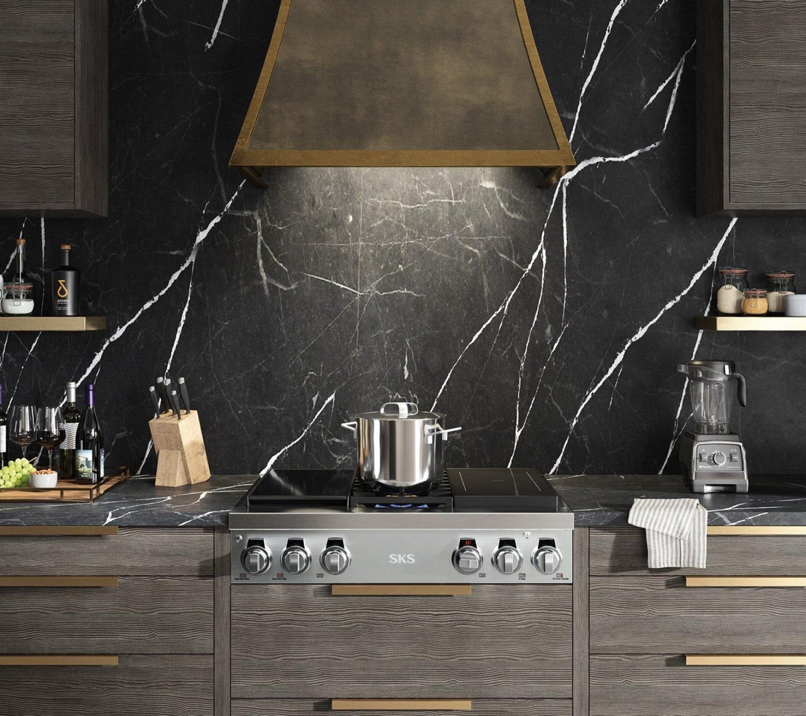 A: Dual-fuel cooktop with two gas burners, two induction zones, and a built-in sous vide module.