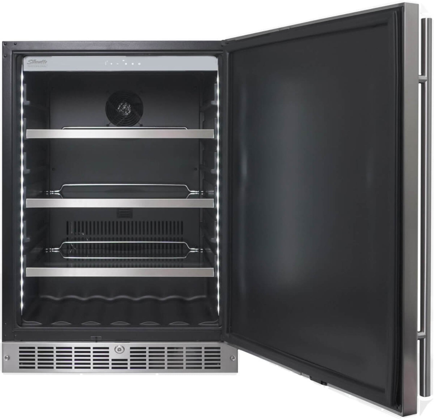 A: A 24″ built‑in under‑counter refrigerator in stainless steel with integrated design for kitchens, bars, or specialty storage.