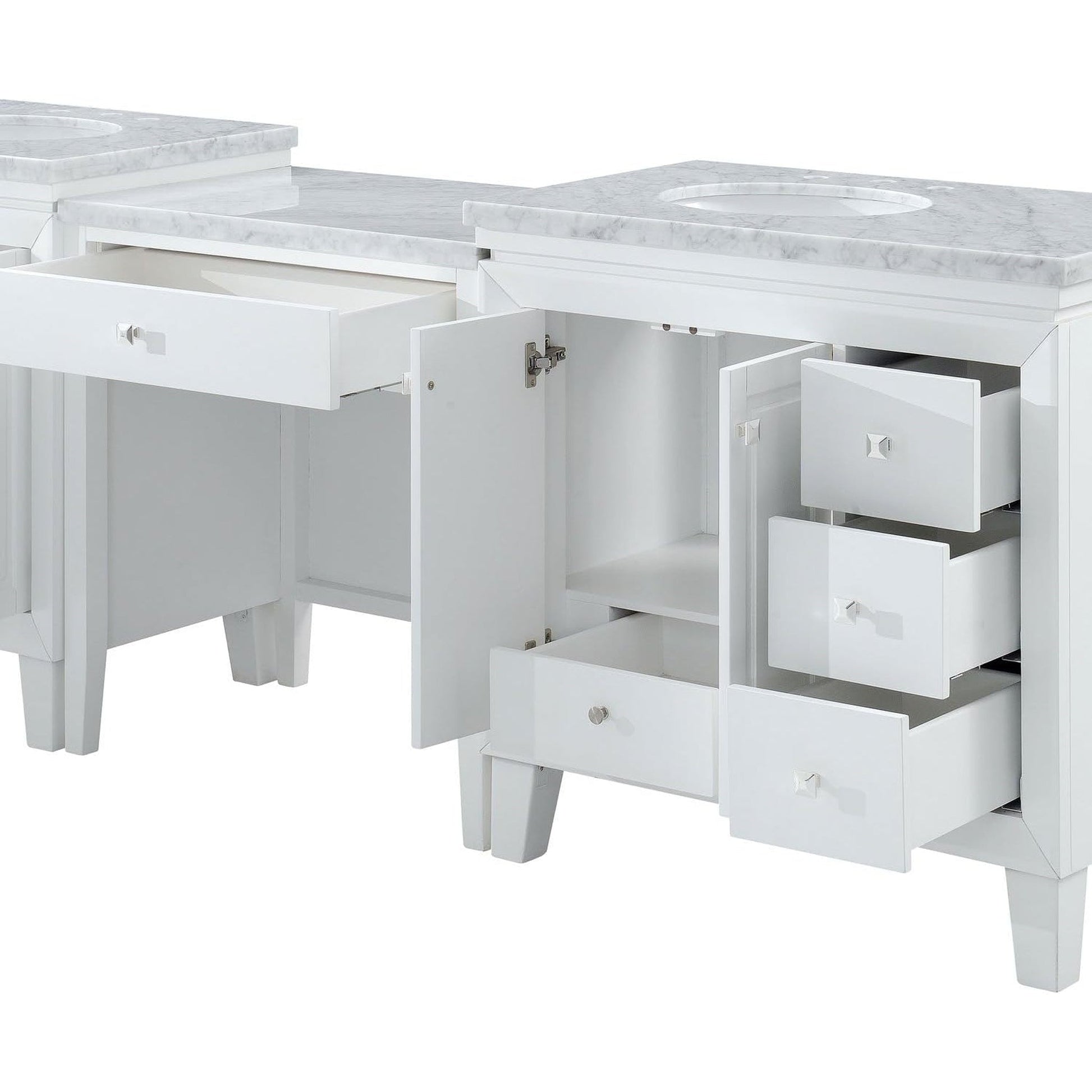 Elevate your bathroom with this stunning Silkroad Exclusive transitional vanity. Crafted with solid wood and CARB Ph2 certified panels, the dimensional frame is finished in white oak for a fresh look. The natural Carrara marble top adds a touch of sophistication and pairs well with any style of bathroom. This double sink vanity boasts nine drawers and four doors for ample storage space.