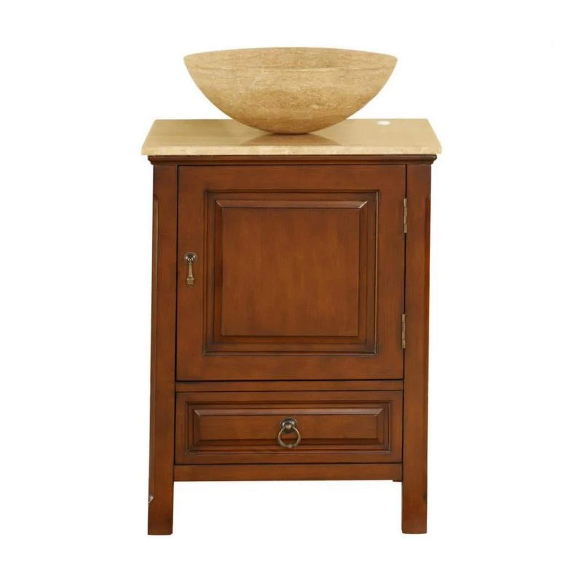 The 22" Single Sink Cabinet makes a bold statement. It features antique cherry finish and travertine countertop. Countertop is pre-drilled to accommodate a vessel bowl sink (sold separately). A single-hole faucet hole is also pre-drilled.