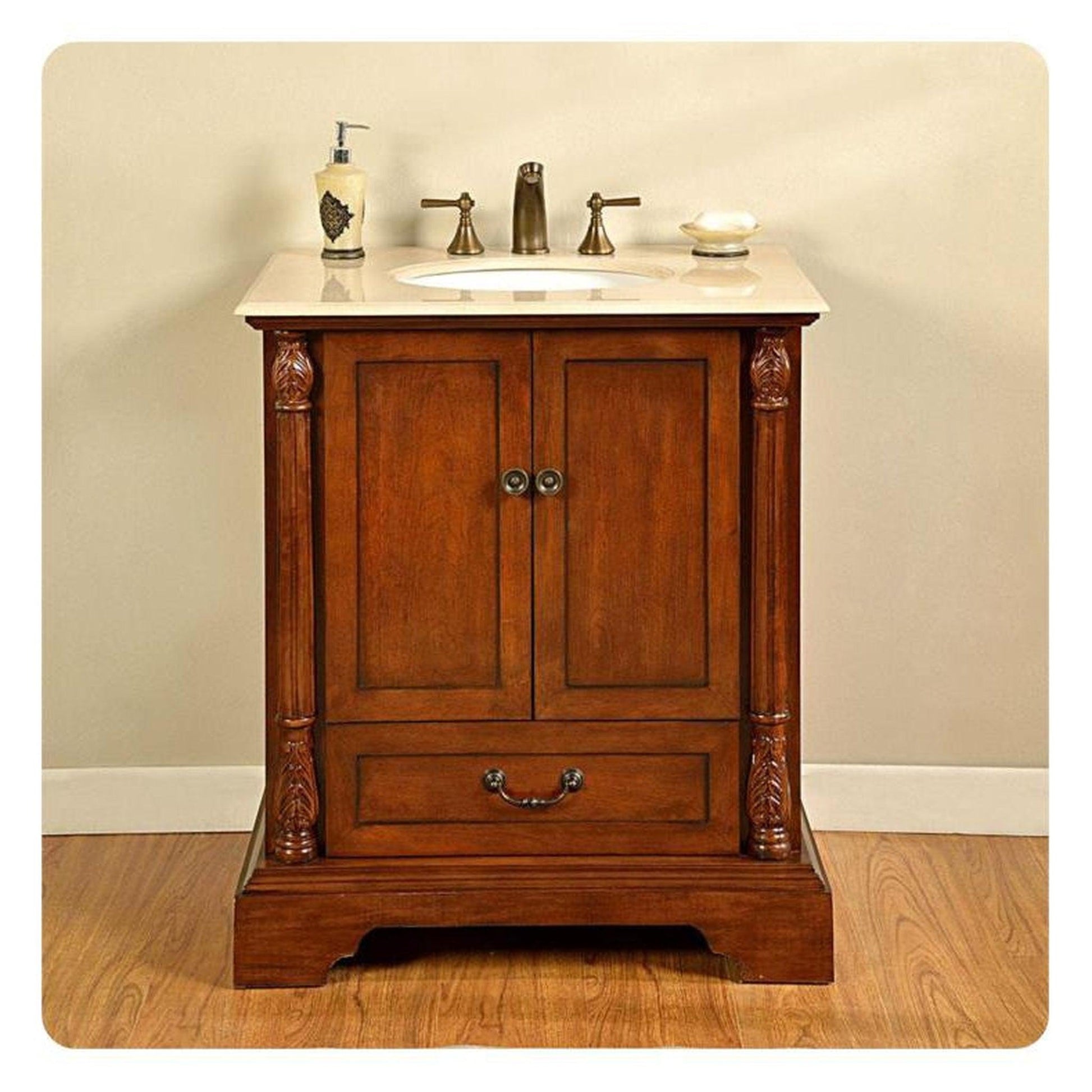 The Silkroad Exclusive 32" Single Sink Bathroom Vanity in Walnut finish is a compact yet luxurious choice for smaller bathrooms or powder rooms.