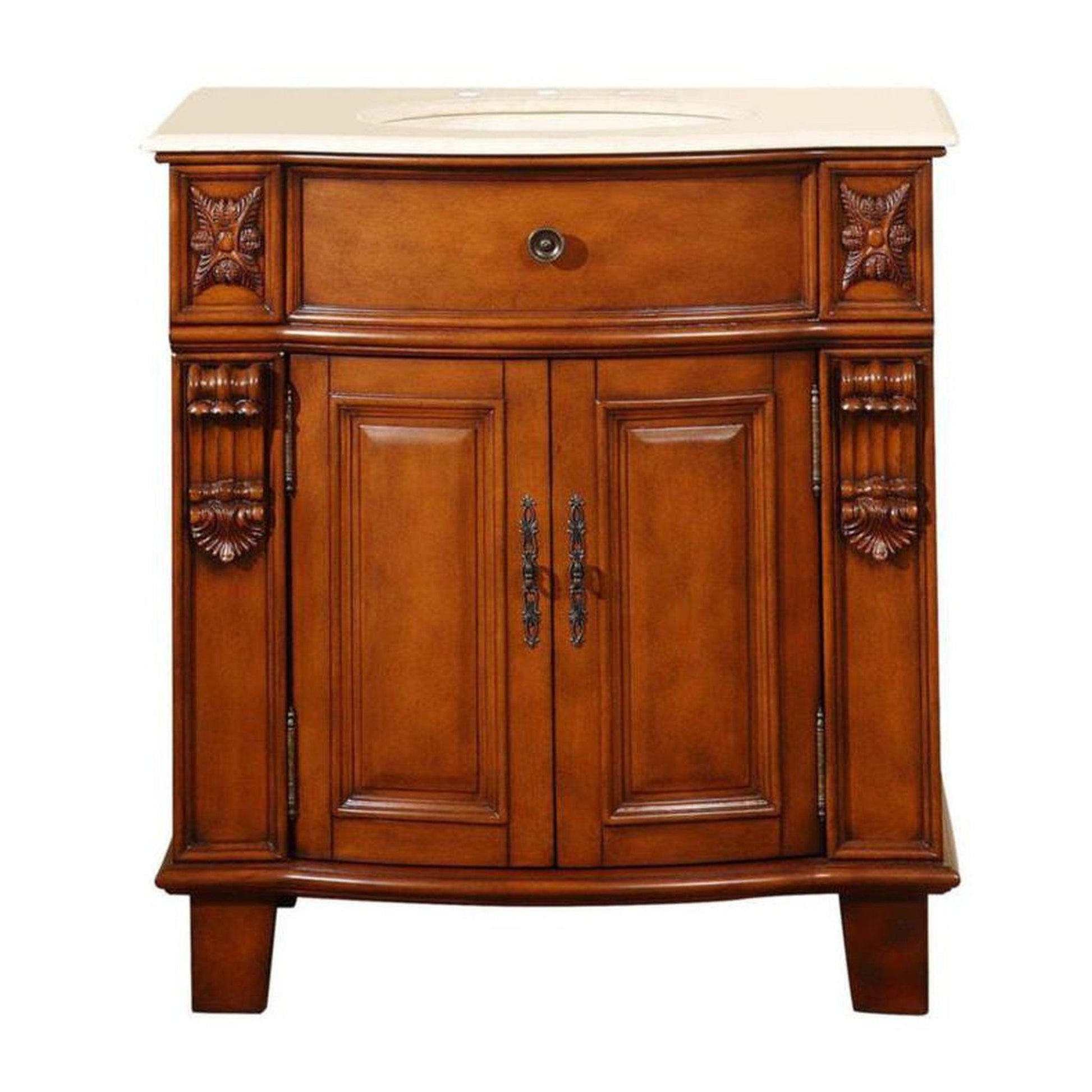 A: Features a rich cherry finish, Crema Marfil marble countertop, and ivory ceramic undermount sink for an elegant bathroom upgrade.
