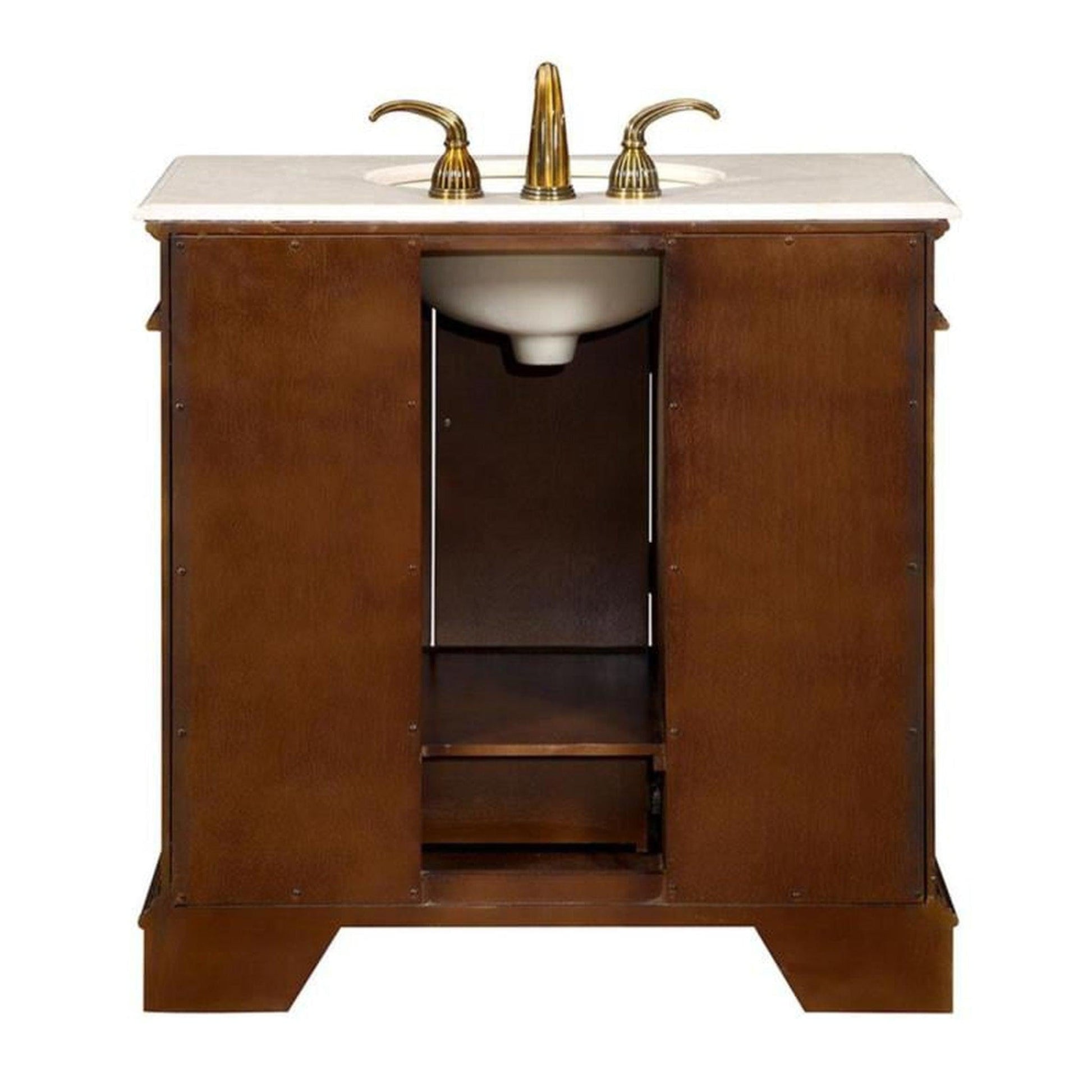 This elegant single sink vanity, featuring our rich English Chestnut cabinet finish, flat panels, ample storage for you to organize all of your bathroom accessories and necessities, you and your guests will admire it for years to come. The natural stone countertop is finished with a beveled edge around the exterior and bowl opening to give the stone a subtle but unmistakable character.