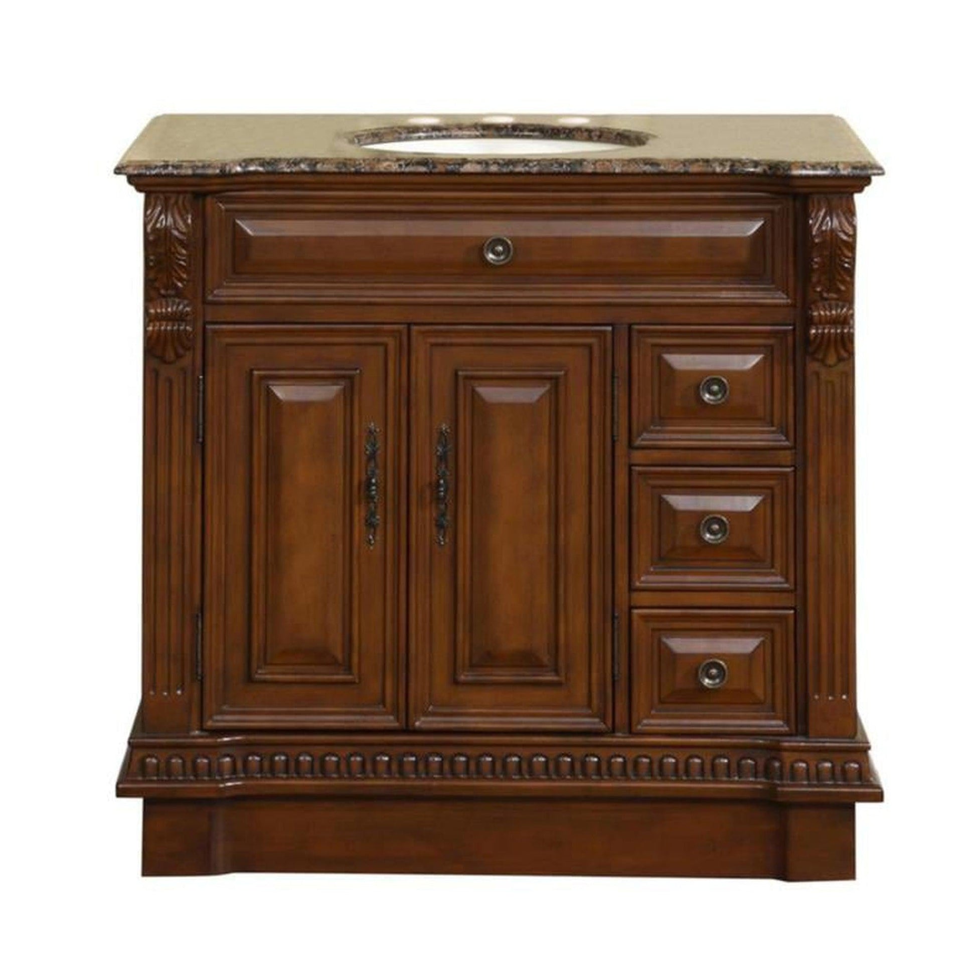 The magnificent Empire style of this single sink bathroom vanity will add a touch of traditional sophistication to any decor and become a focal point in your bathroom. Give your newly remodeled bathroom the appeal and attention it deserves with this beautiful piece. Featuring our rich English Chestnut cabinet finish, intricately detailed accents, this bathroom vanity has a sturdy profile. The shape of the stone top reflects the shape and counters of the cabinet and it is also finished with a beveled edge around the exterior and bowl opening, adding a subtle but distinct character that your guest will absolutely revere.