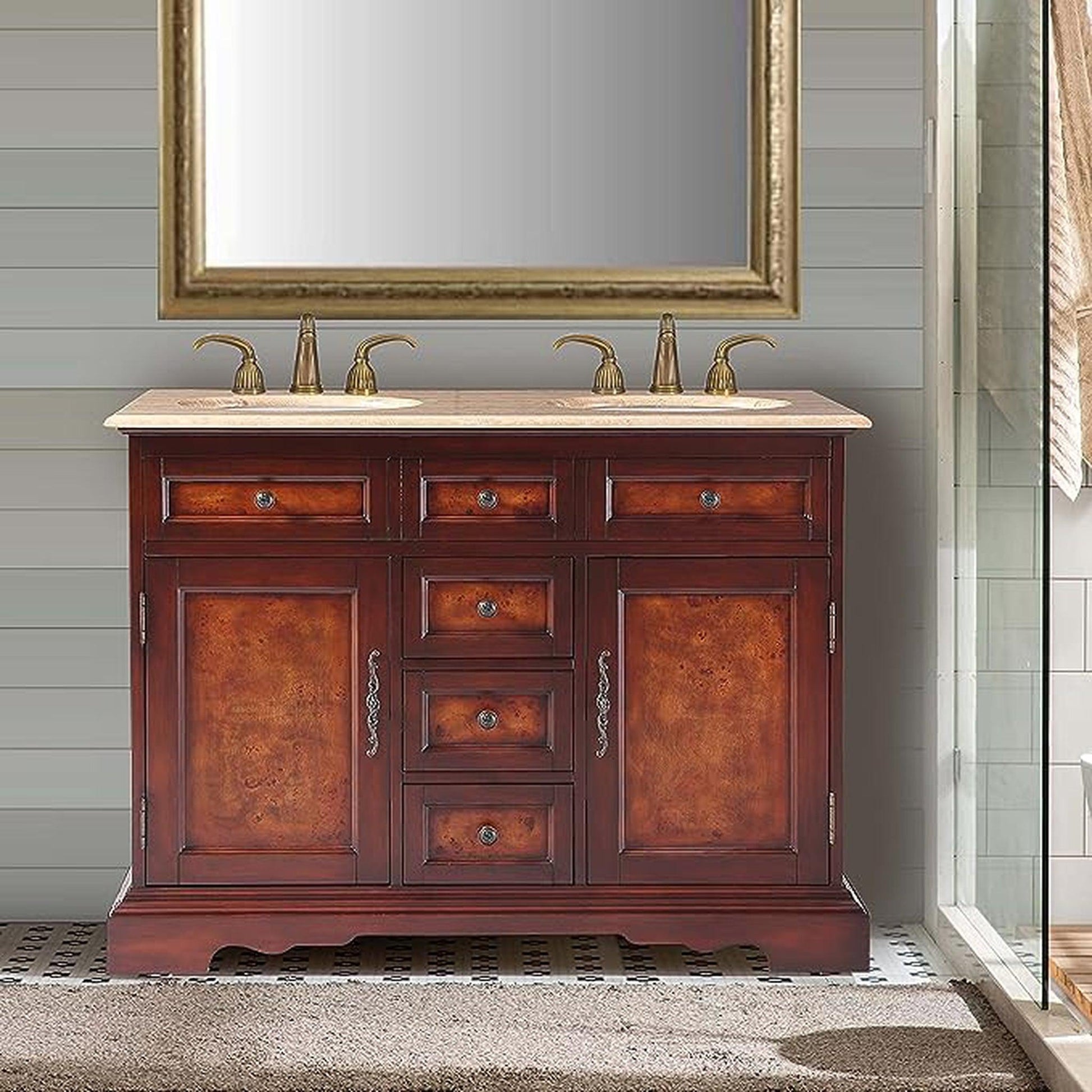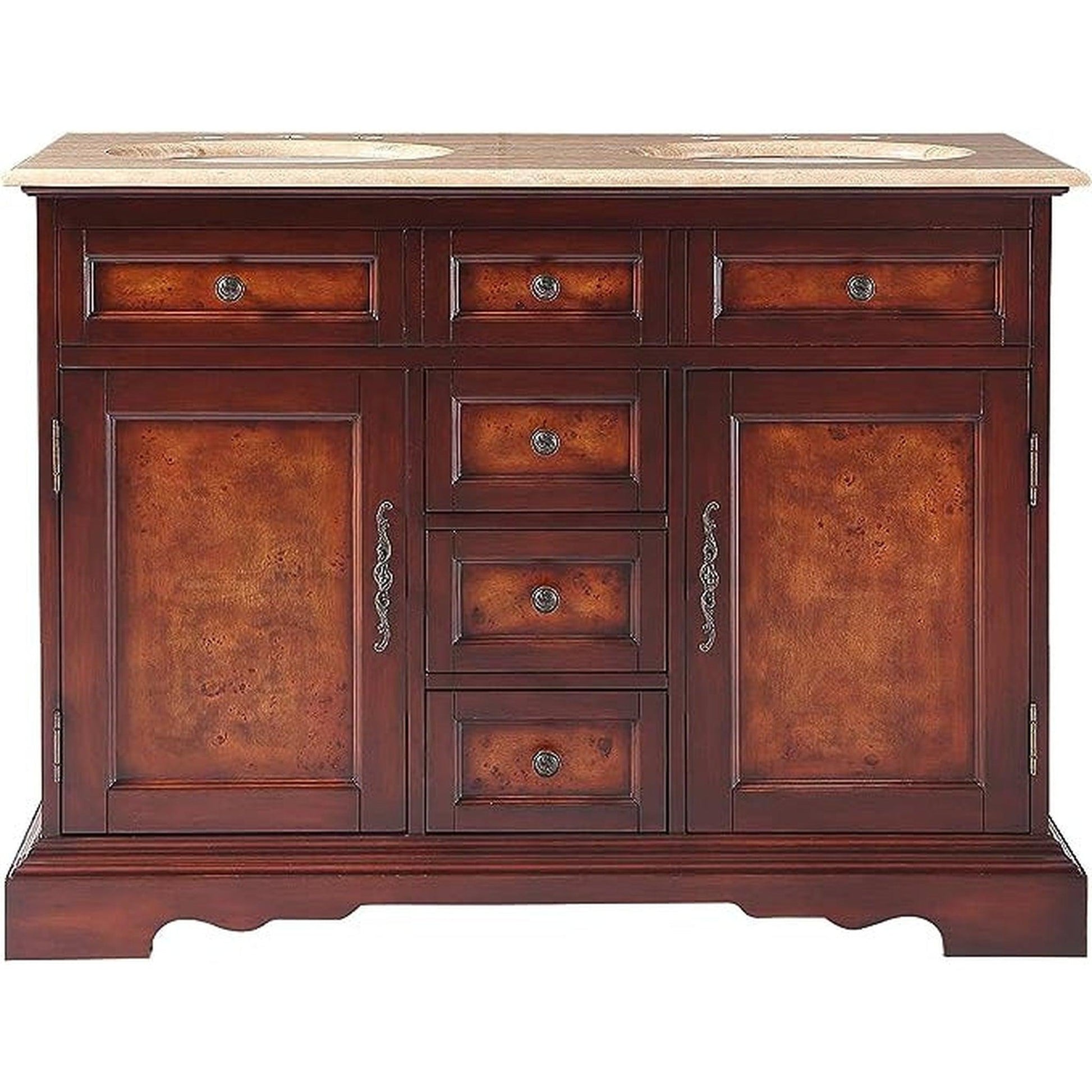 This sturdy double sink vanity features our rich Red Chestnut finish, recessed panels, great storage design for you to organize all of your bathroom necessities and accessories. It comes with granite and travertine counter top, ivory sinks, cabinet and antique brass hardware.