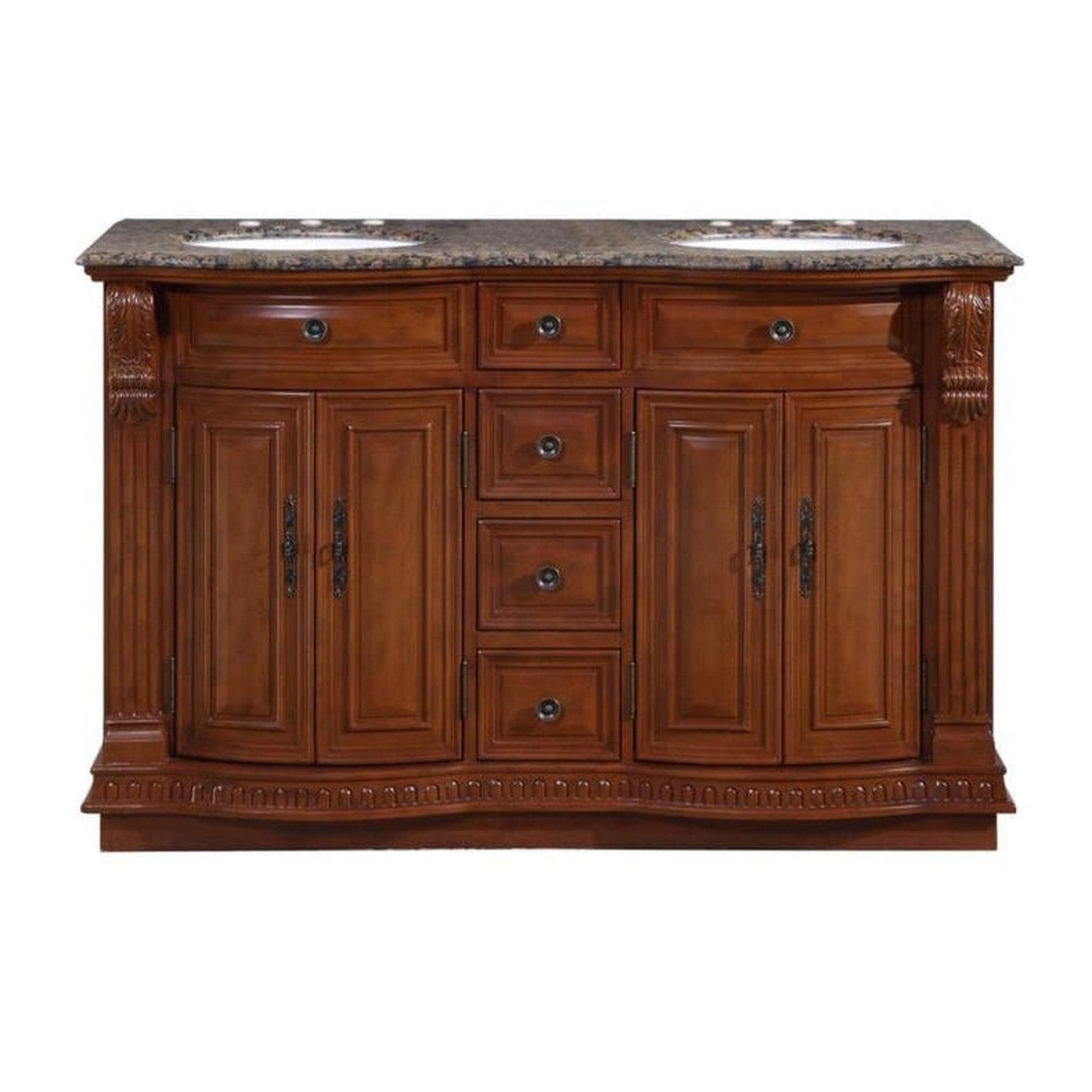 The magnificent Empire style of this elegant double sink bathroom vanity will give any bathroom the attention and appeal that it deserves. Our rich Cherry cabinet finish matches well with the deep natural coloring of the granite stone, which is finished with a beveled edge around the exterior and bowl opening. This transitional styled vanity bath cabinet will easily add a touch of sophistication and functionality to any decor.
