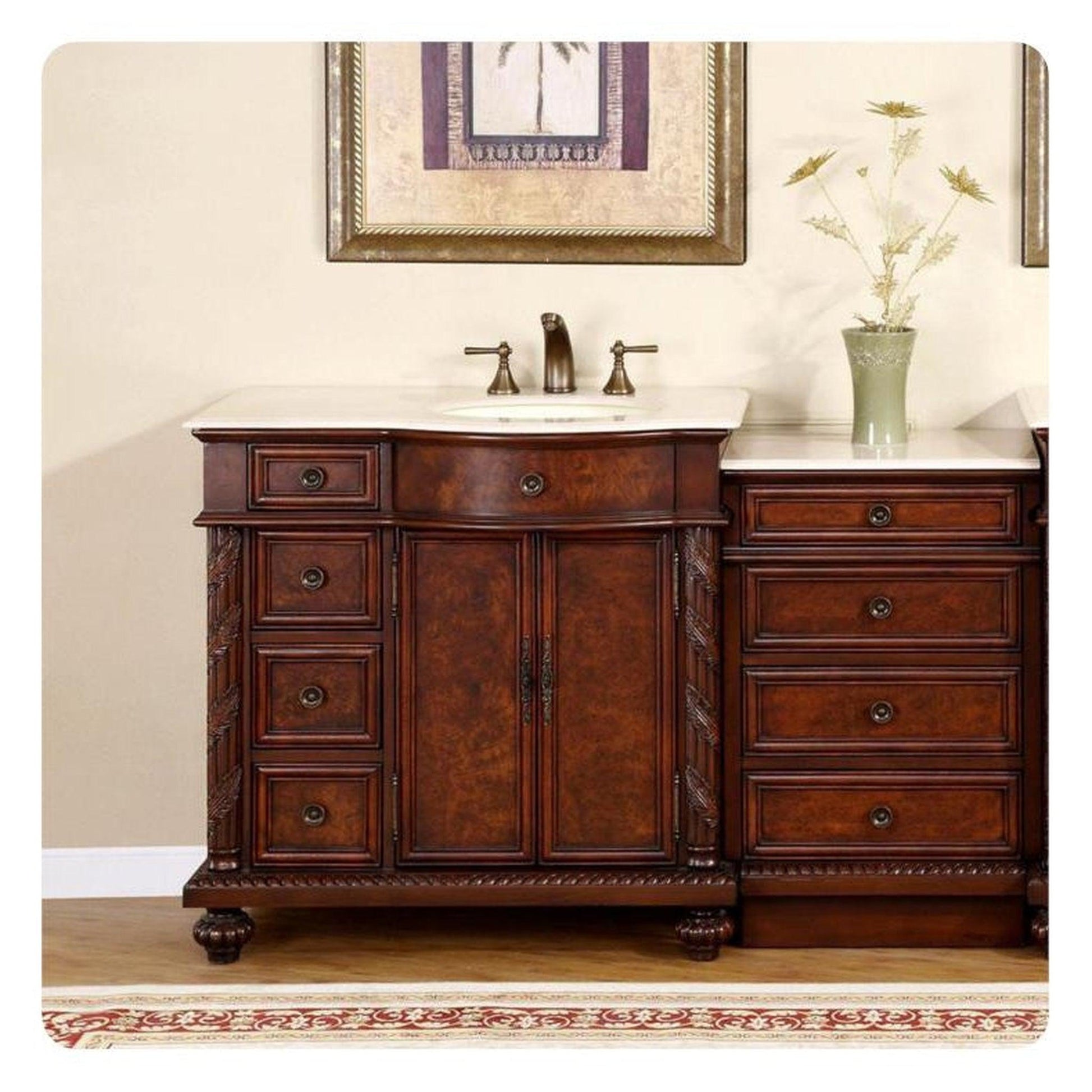 This charming Early American style modular bathroom sink vanity will add some style and elegance to your bathroom. The contrasting colors give the vanity a knotty wood appearance and features a rounded leading front edge that creates a graceful curve of both the stone and cabinet. Our rich English Chestnut finish, antique brass handles, all natural solid crema marfil marble stone counter top and the detailed decor along the sides and legs thoroughly accentuate the sturdy profile.
