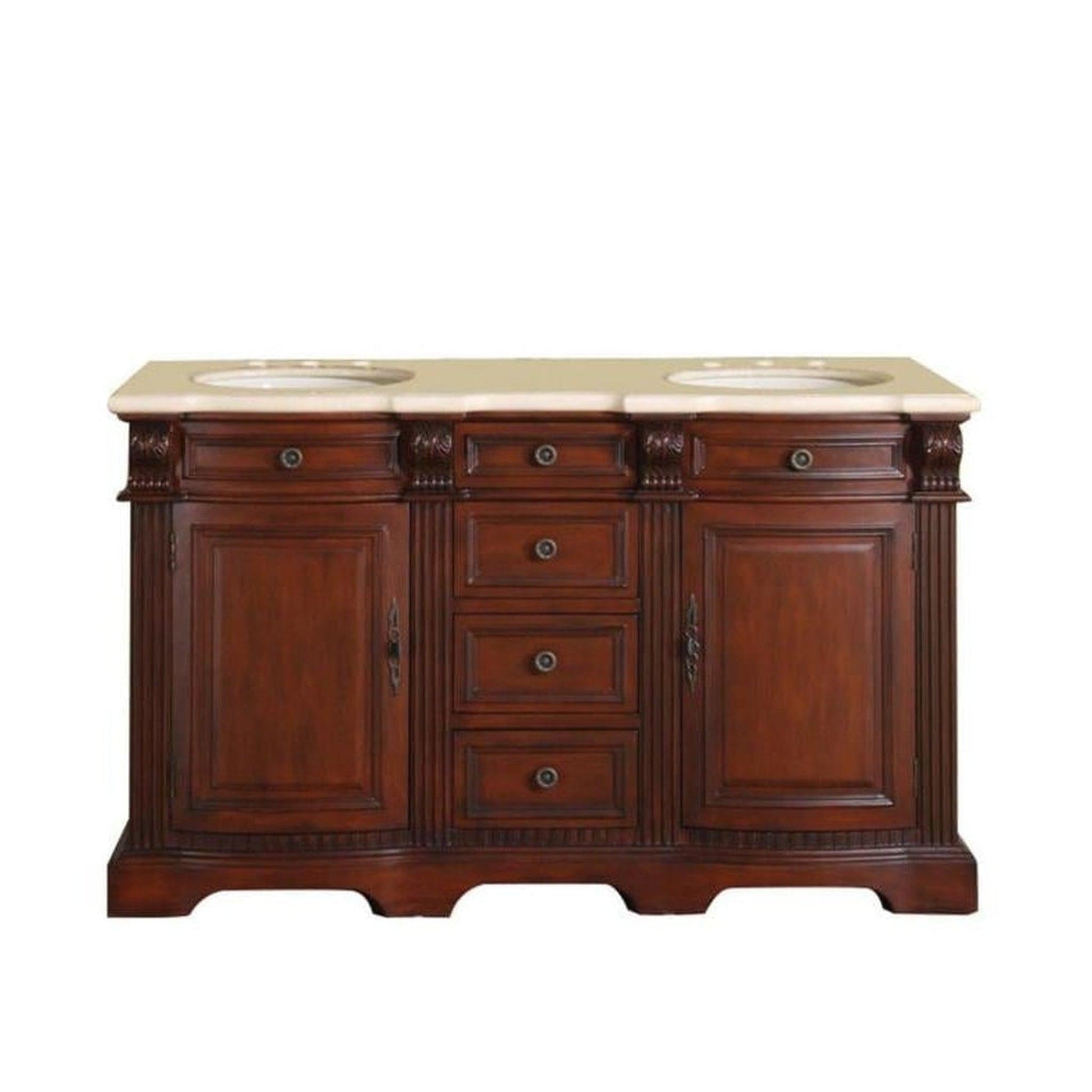 The appealing design of this vanity is sure to bring a touch of sophistication to any bathroom. This beautiful bathroom sink vanity features our rich Brazilian Rosewood cabinet finish, raised panels, classic antique brass handles, white ceramic under mount sinks, great storage design for you to organize all of your bathroom necessities, intricate details to accentuate the sturdy profile and our all natural solid cream marfil marble stone counter top with pre-drilled faucet holes to accommodate any standard 8" widespread faucets of your choice. The charm of this vanity will surely add a touch of attraction to your bathroom.