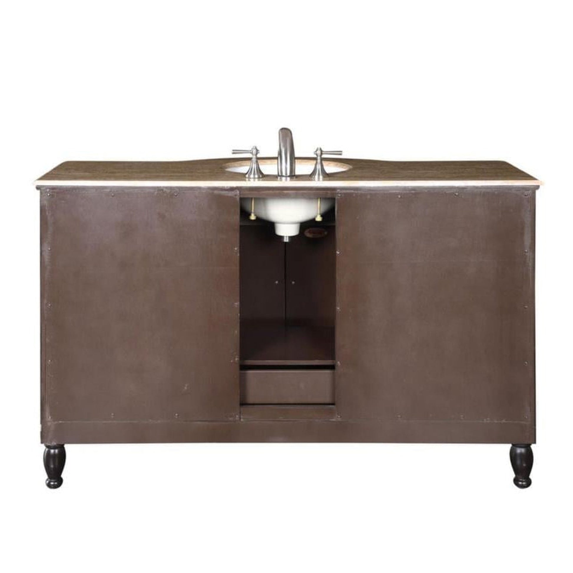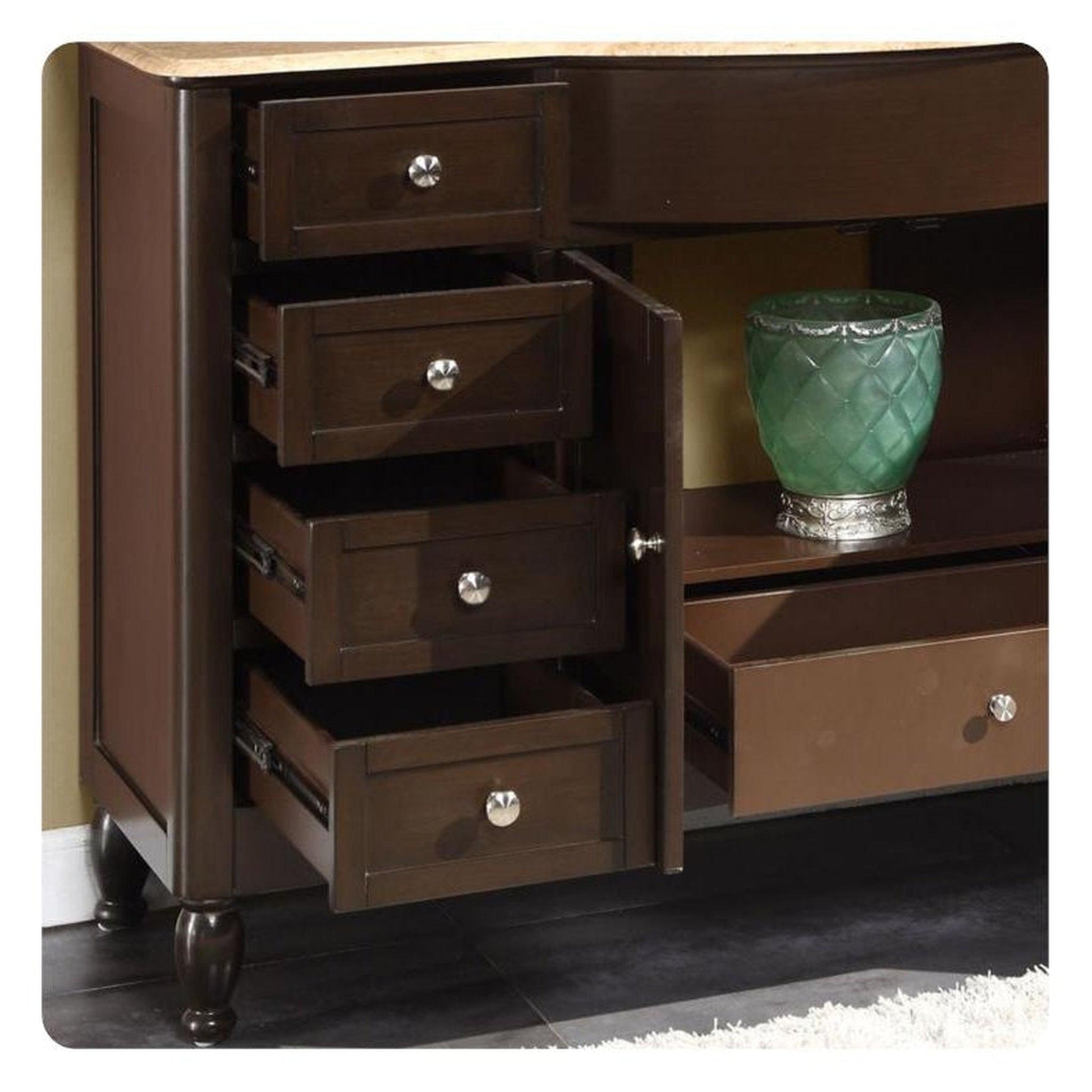 The charming colonial style single sink vanity with smooth graceful lines and a unique design. The hidden drawer provide extra discreet storage. This bathroom vanity will definitely be a wonderful companion for any bathroom with deep Dark Walnut finish cabinet and eye-catching brushed nickel handles. The stone top is finished with a beveled edge around the exterior and bowl openings to add character to the sink vanity.