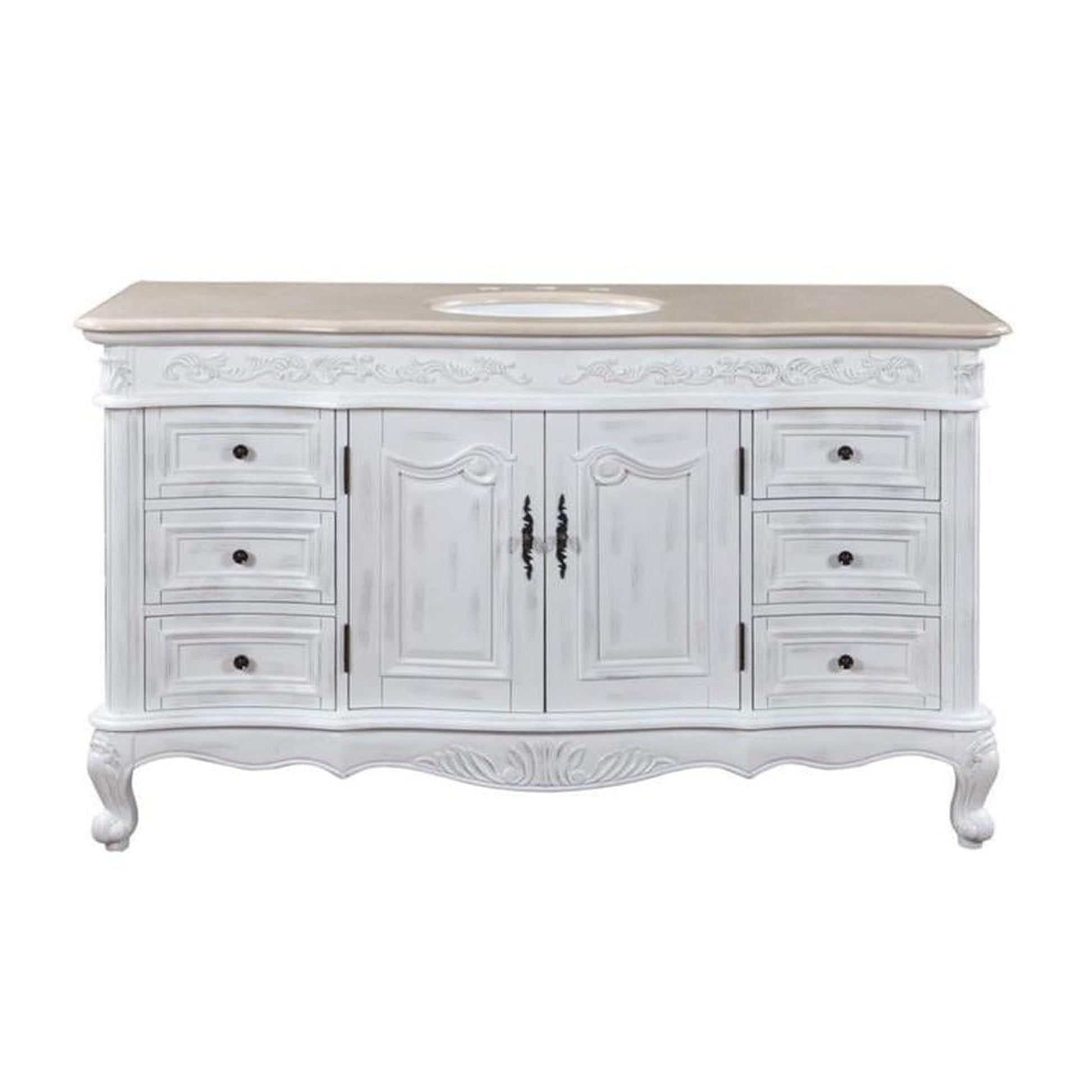 The Ella single sink bathroom vanity cabinet features a luxuriant Aged White Oak wood finish. This is beautifully complemented by the crema marfil marble countertop. With two doors, seven drawers and one shelf storage area, you have ample room for all your bathroom necessities. Keeping in theme with the elegant design are the undermount bowl sink, Spanish scroll feet and floral motif carvings.