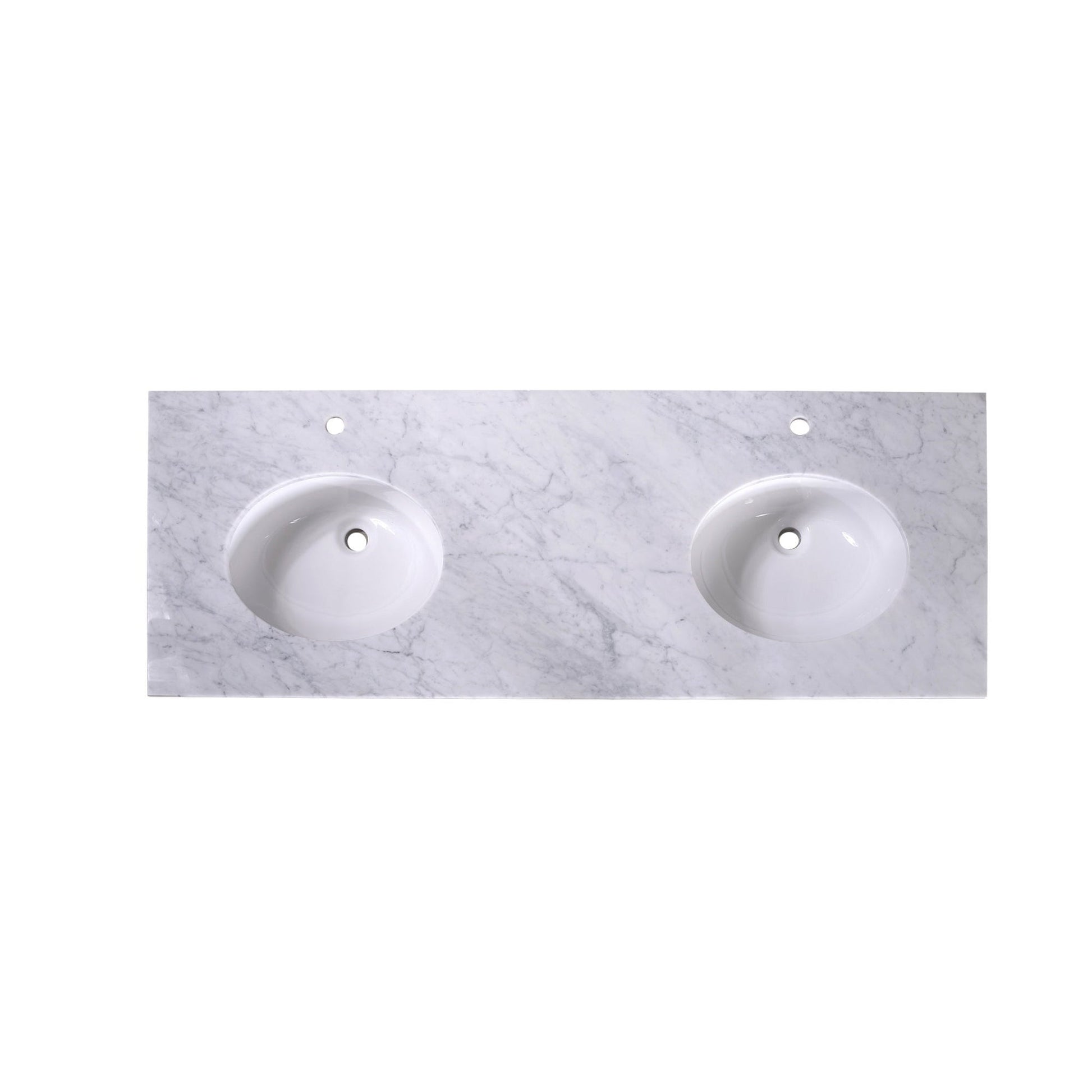 The Silkroad Exclusive 60" x 22" White Carrara Marble Vanity Top with double oval undermount sinks delivers luxurious style and practical functionality for shared bathrooms.