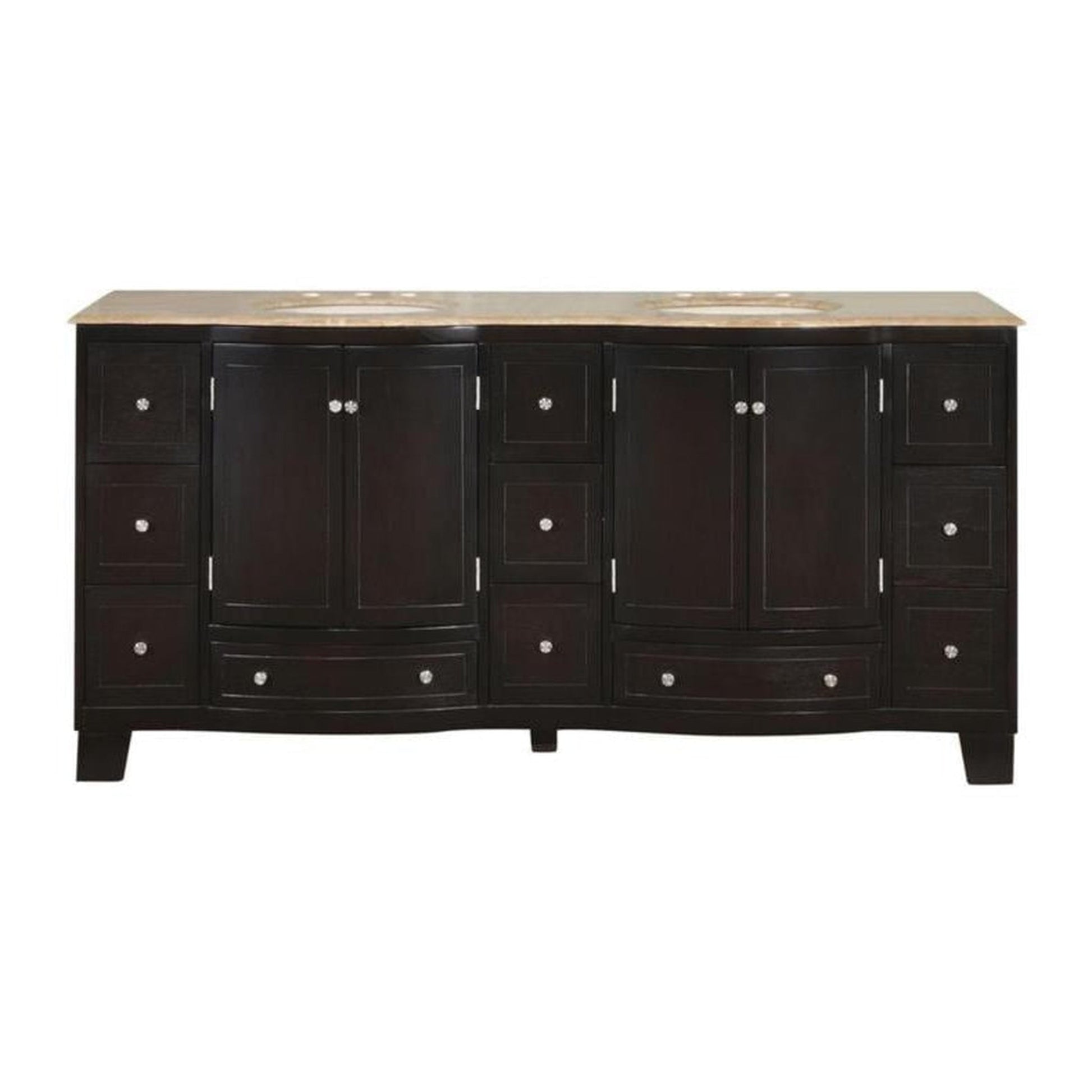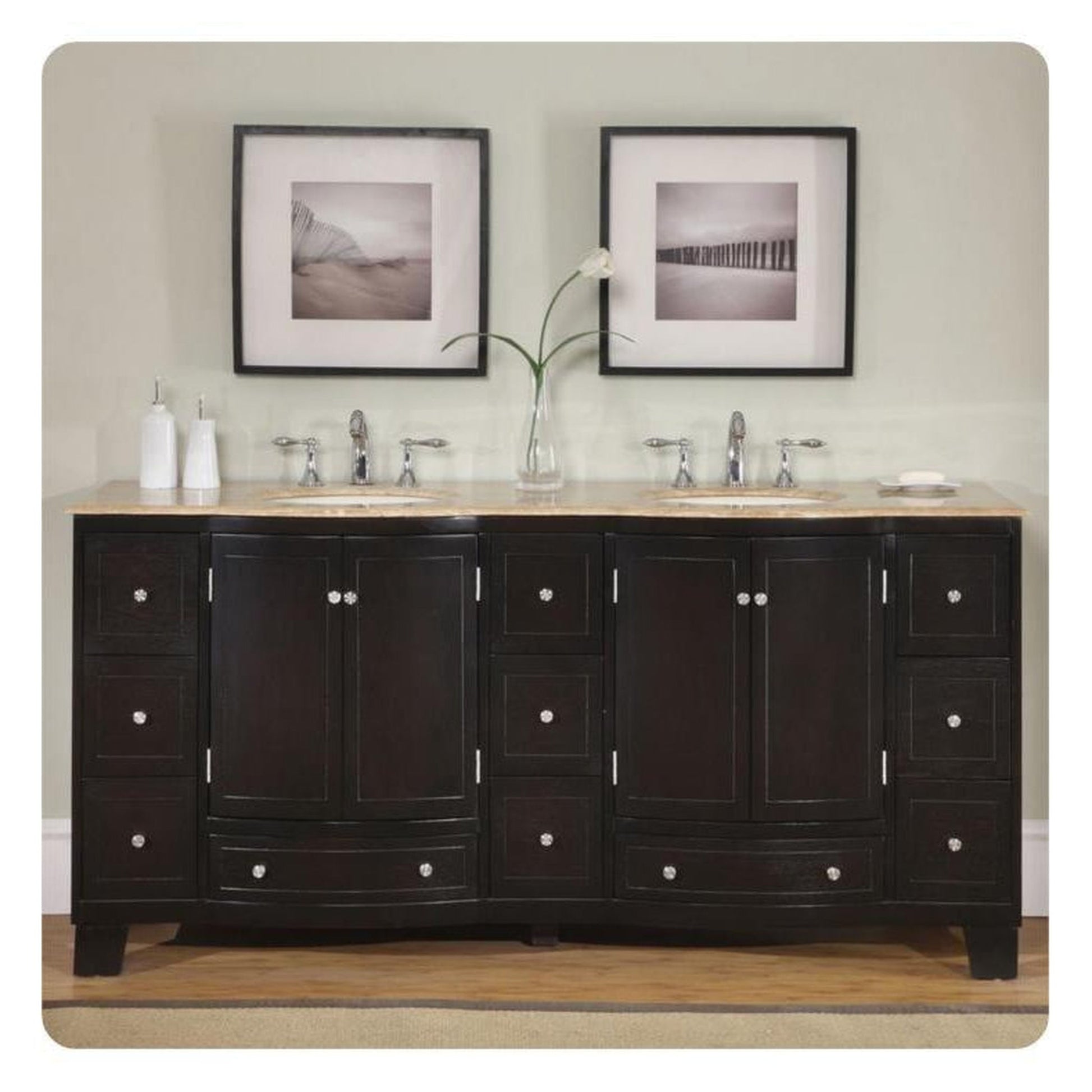 This streamlined and sleek double sink vanity featuring plenty of storage space, it will be great for organizing all of your bathroom necessities and accessories. Our pitch dark Espresso wood finish cabinet, eye-catching brushed nickel designer handles and all natural solid travertine stone counter top will add just the right amount of class and taste to your bathroom renovation.