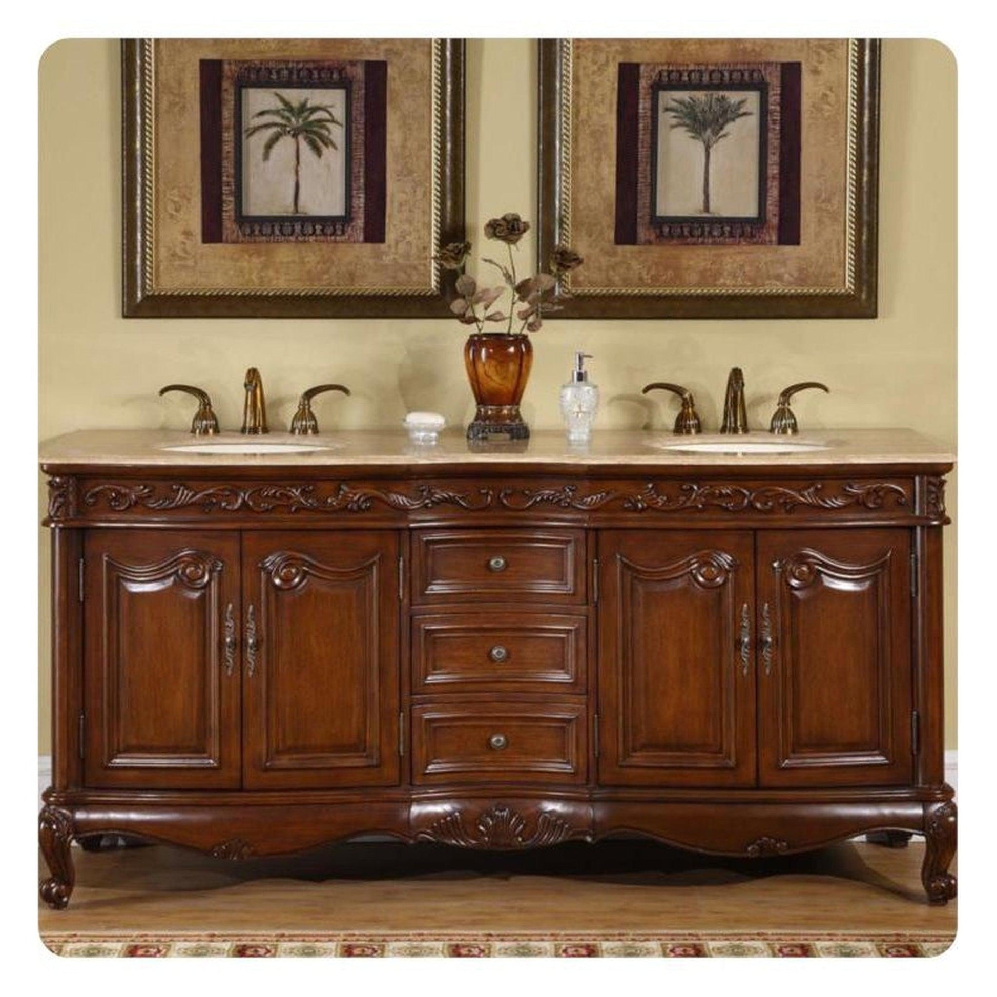 A: Dark chestnut wood vanity with a travertine countertop and travertine round vessel sinks.