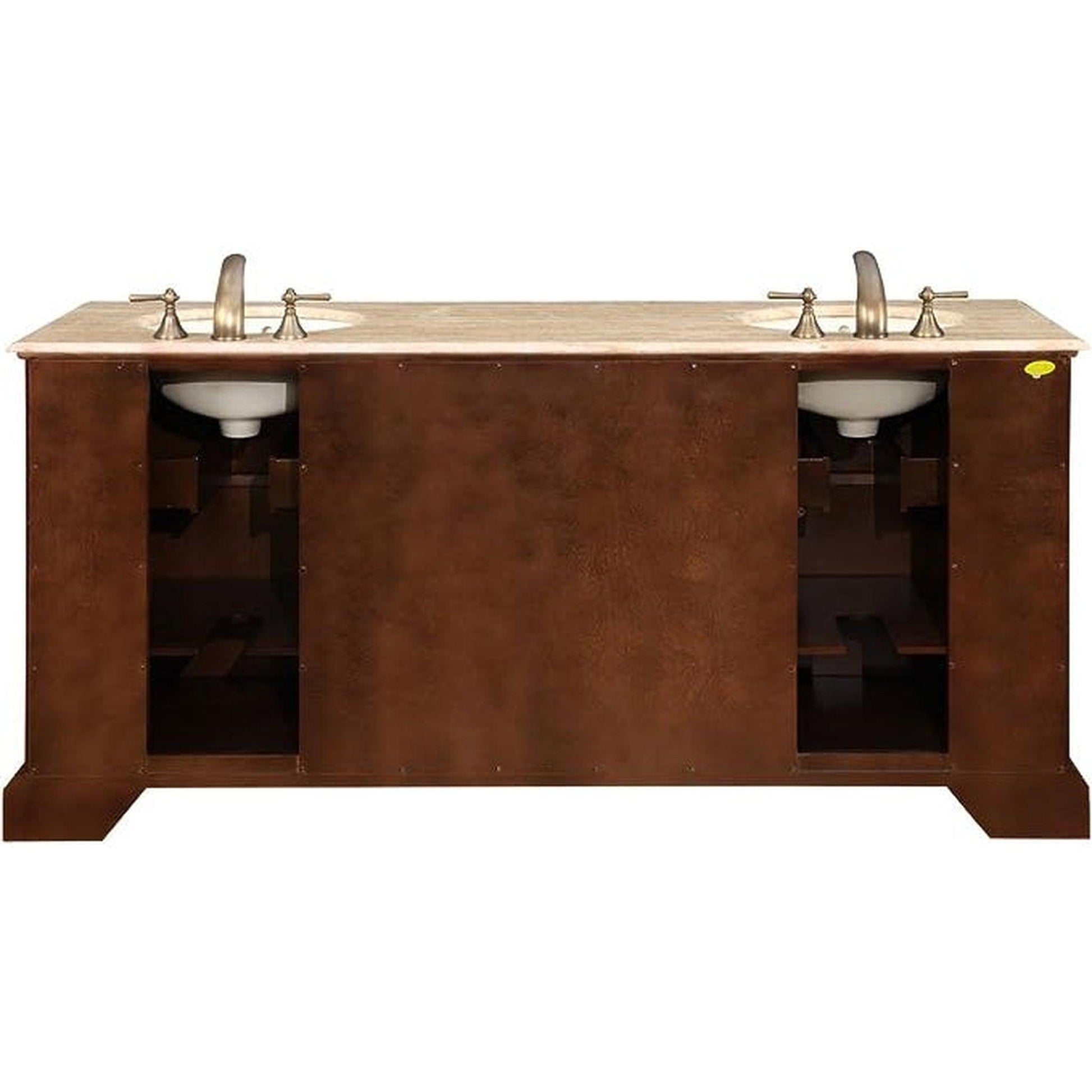 This sturdy double sink vanity features our rich Red Chestnut finish, recessed panels, great storage design for you to organize all of your bathroom necessities and accessories. It comes with granite and travertine counter top, ivory sinks, cabinet and antique brass hardware.