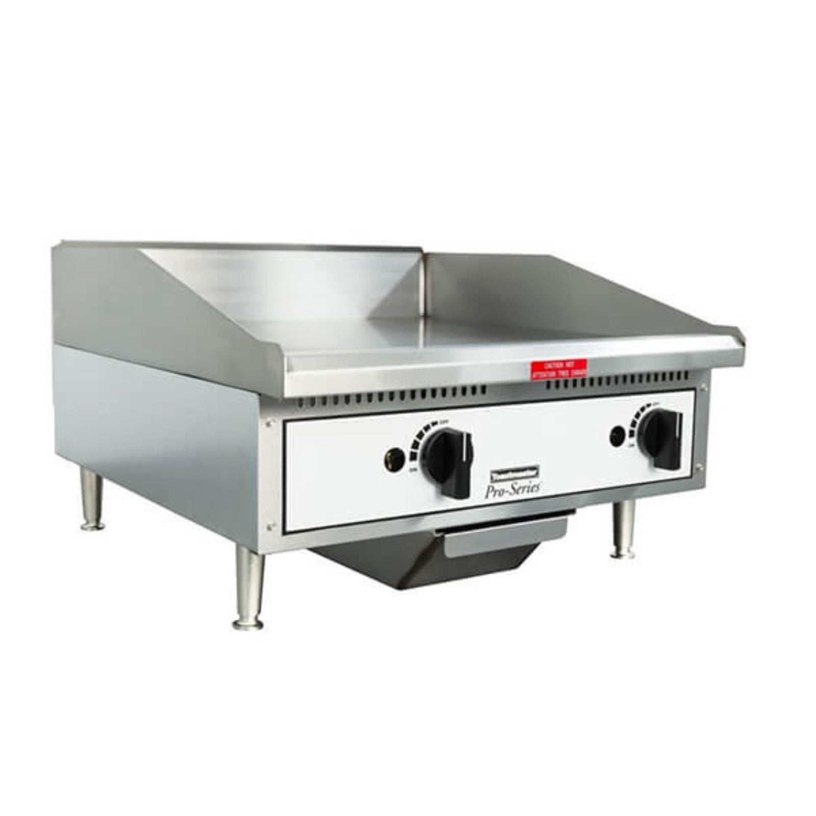 The Star Toastmaster TMGM24 Gas Griddle is a versatile 24" wide countertop griddle with manual control. It's known for its exceptional performance, combining a reliable control system with Toastmaster's renowned quality and durability. This griddle is shipped for natural gas but can be easily converted to LP gas using the included orifices, making it a flexible choice for your food service needs.