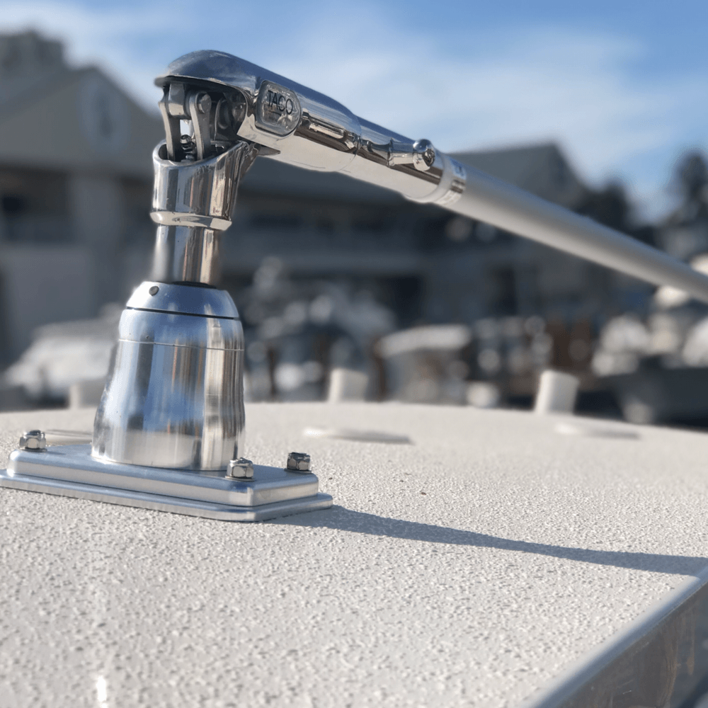 For anglers craving a more competitive edge on the water, the heavy-duty Grand Slam 390 Outrigger Mount steps up to the challenge. We took all the durable, dependable features of the popular GS-380 and incorporated a more robust gusset and thicker arm to withstand the torque and pressure created when using longer outrigger poles. This base is perfect for the bigger, faster center console boats between 25’ and 40’. Anglers can easily deploy an outrigger’s vertical lift and horizontal rotation from the boat deck in rough seas. Additionally, the GS-390 comes equipped with our secure pin-locking technology and pairs well with TACO’s Deluxe Aluminum and Carbon Fiber Tele-Outriggers.