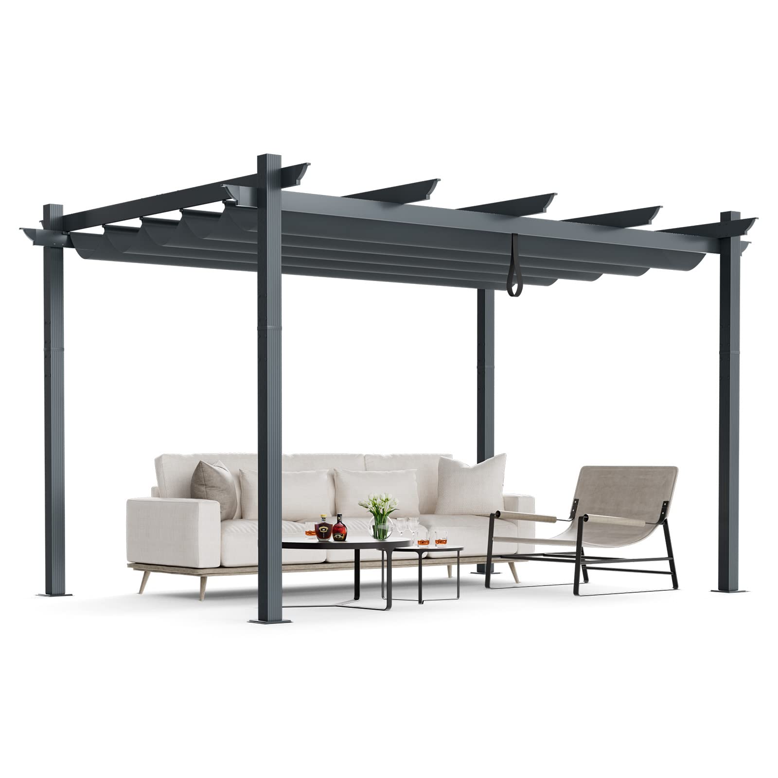 If you need an outdoor party space, our retractable pergola is a good choice. The canopy of the pergola is retractable and can be fixed by a safe locking system. Flexible pulleys and convenient rope loops will allow you to control it effortlessly. The canopy is made of durable yarn-dyed fabric that is waterproof, sun-proof, anti-fade, and wear-resistant. The whole frame of the grill pergola adopts powder coated aluminum frame, which has good stability and rust resistance. In addition, the wide base features 4 pre-drilled holes, which is convenient to insert screws to fix on various kinds of floors. (Please reserve 9.8"x 9.8" space for installing each metal foot.) This pergola offers a generous 13' x 10' shaded area, making it an excellent choice for chatting and gathering with your family and friends. And the classic color scheme makes it adds elegance and ambiance to your garden, pool, patio, or courtyard.