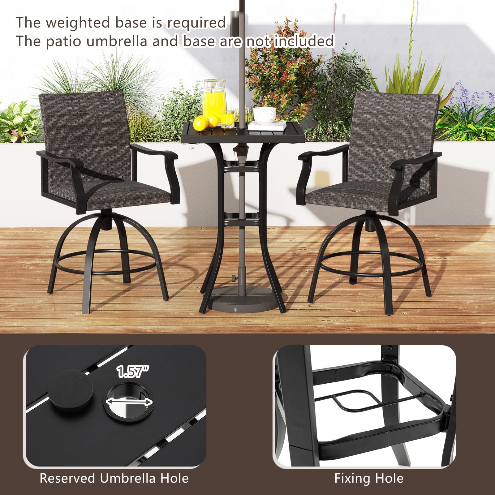 - Convenient Umbrella Hole: This outdoor bar table includes a 1.57" umbrella hole with a fixing hole to secure your patio umbrella (not included) during those sunny days. Note: The weighted base is required (not included).