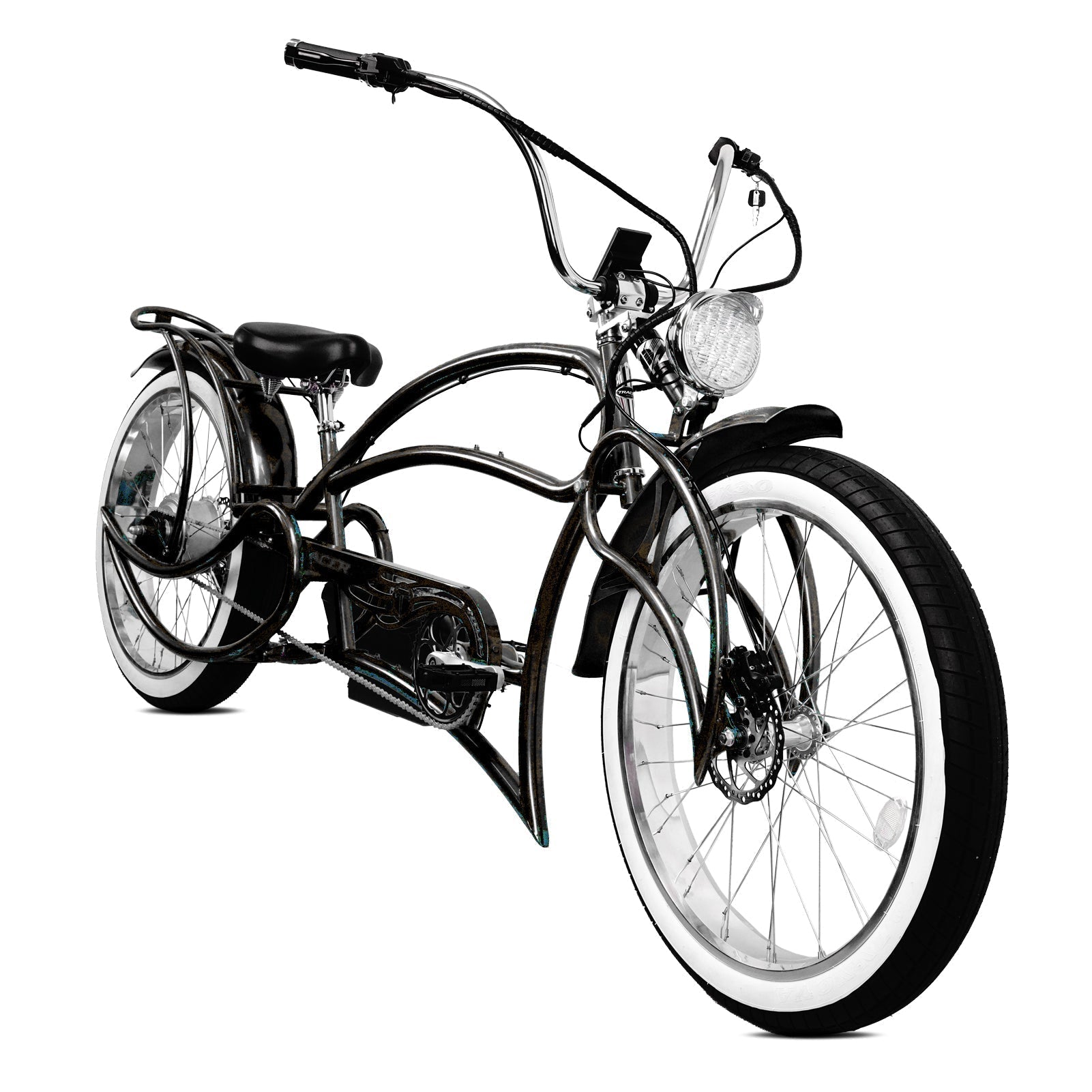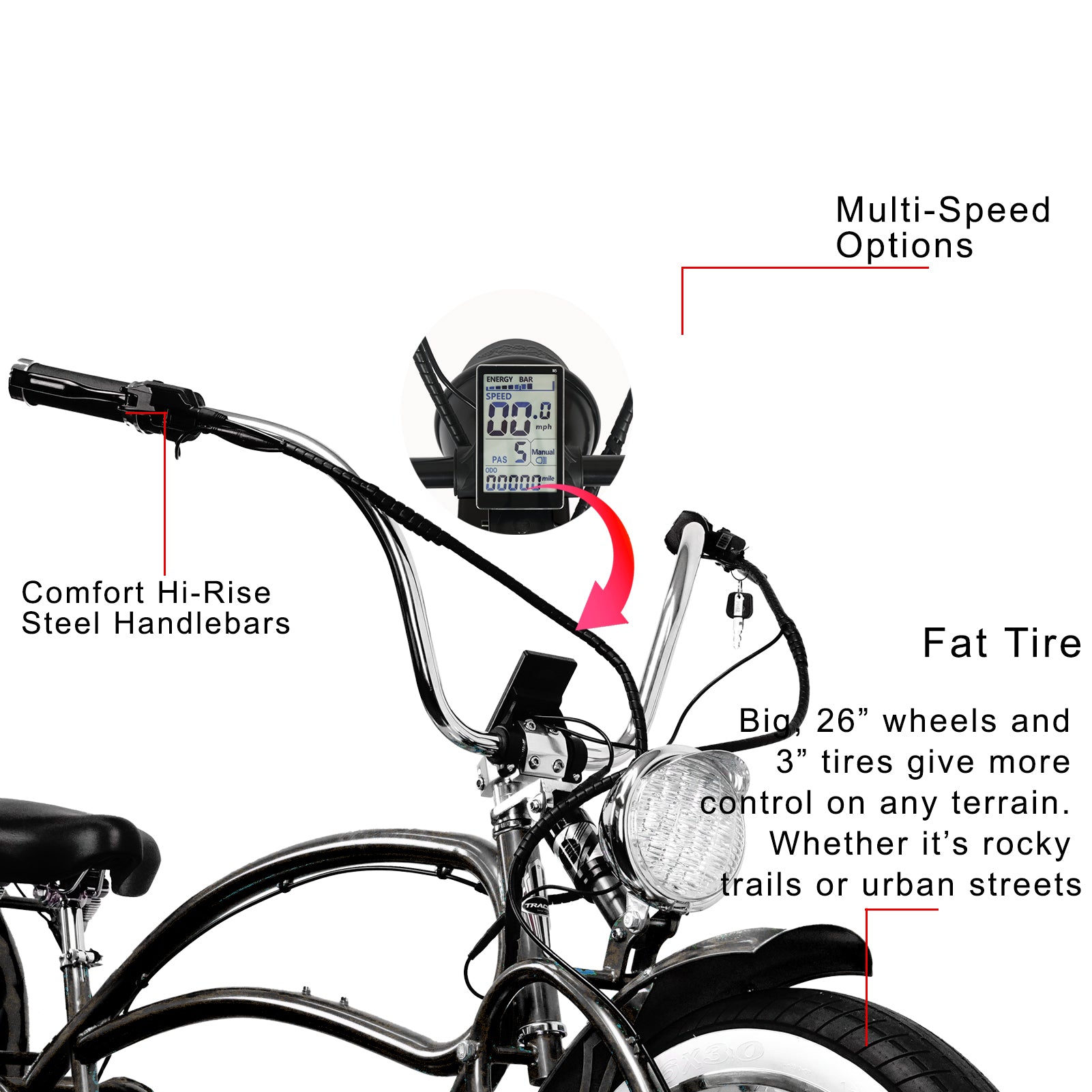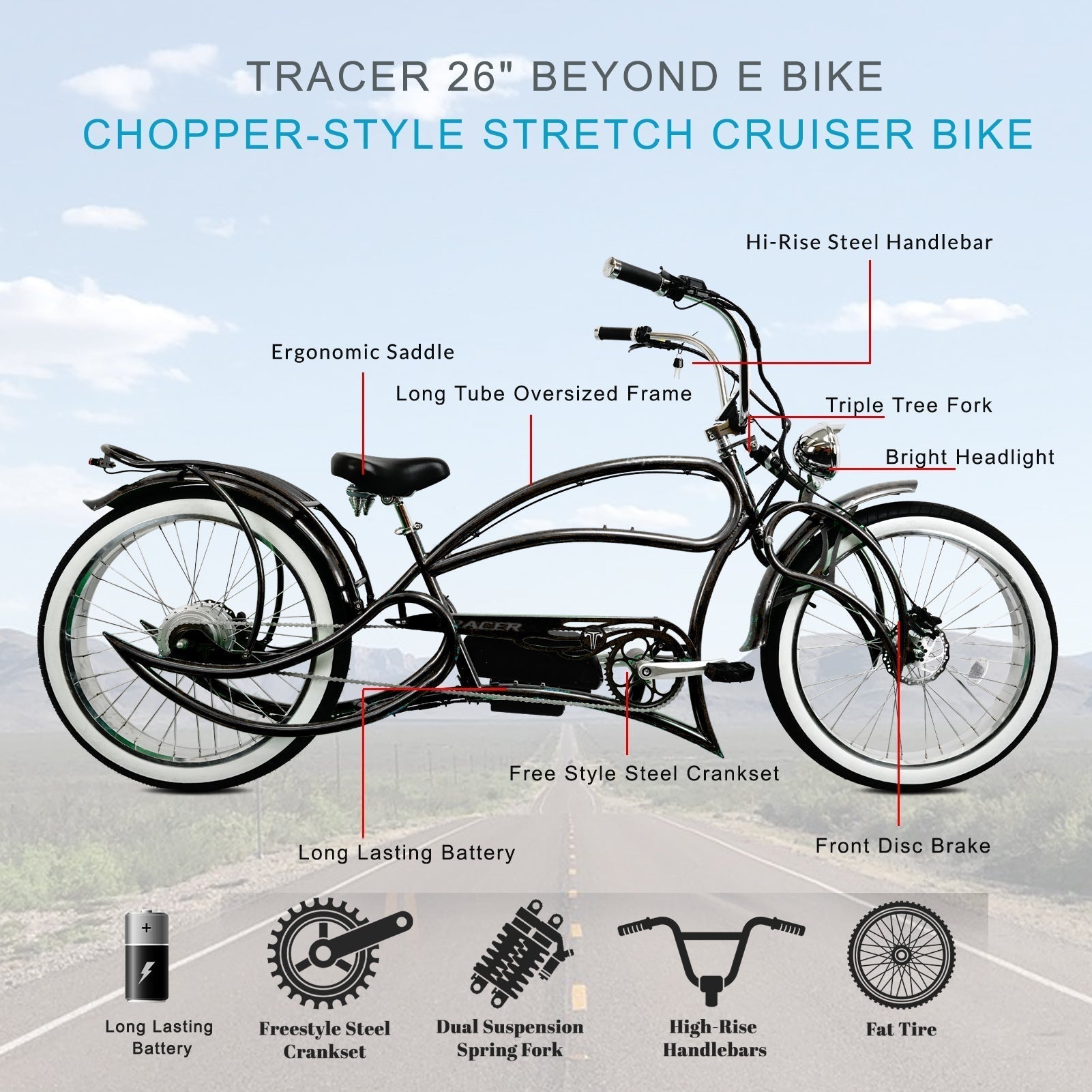 Introducing the Tracer Classic Stretch Chopper Hi-Ten Steel Electric Bike, the perfect combination of style, power, and comfort. With a sleek and stylish design Equipped with a Tracer Classical Springer Disc Brake fork and a Springer Suspension shock, you'll experience a smooth and comfortable ride, even on bumpy roads.