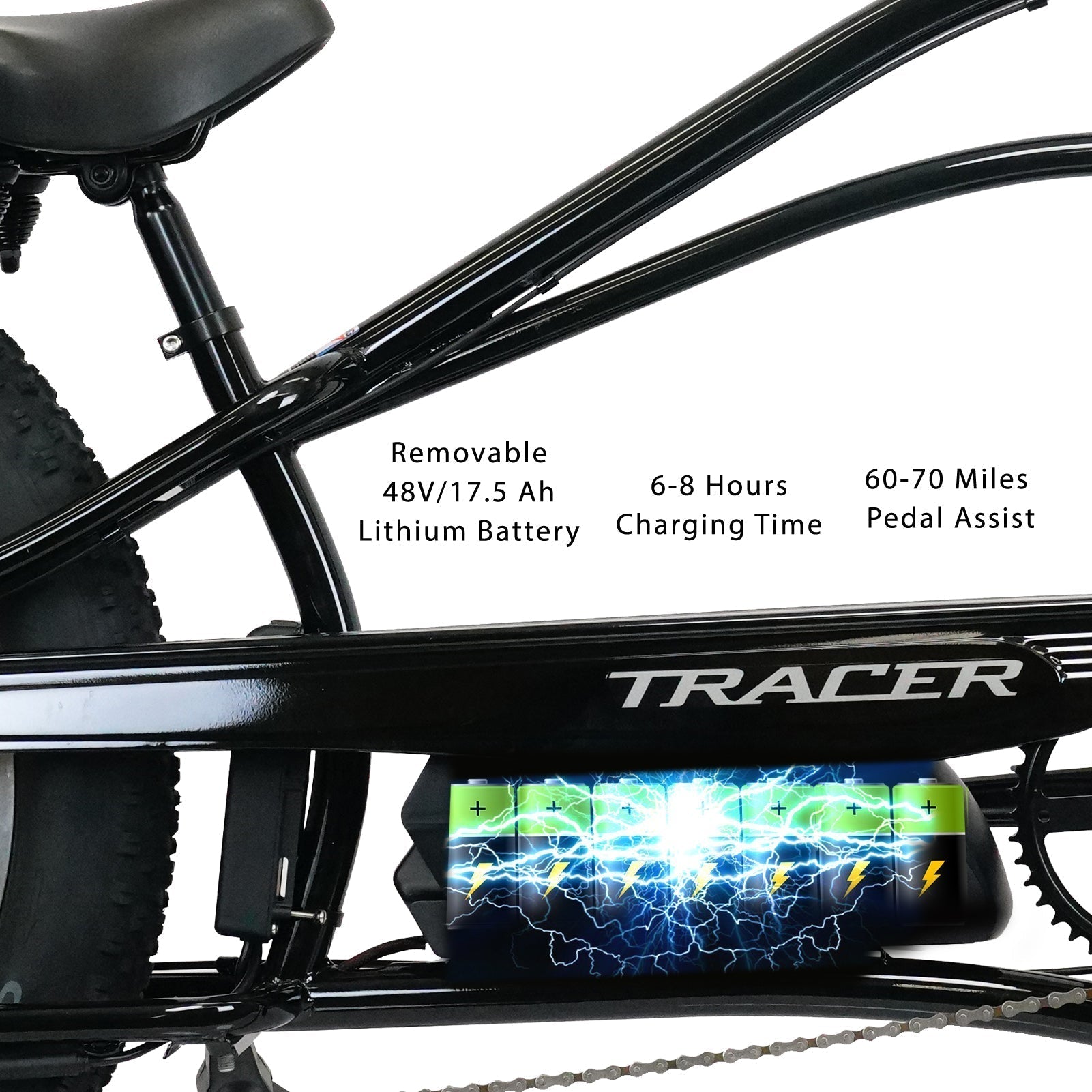 The Tracer 800W Tracker DS7 is a 26" stretch electric cruiser bike featuring an 800W brushless motor, Shimano 7-speed gearing, and powerful disc brakes. Its classic design, combined with modern electric power, makes it perfect for riders looking for both style and performance.