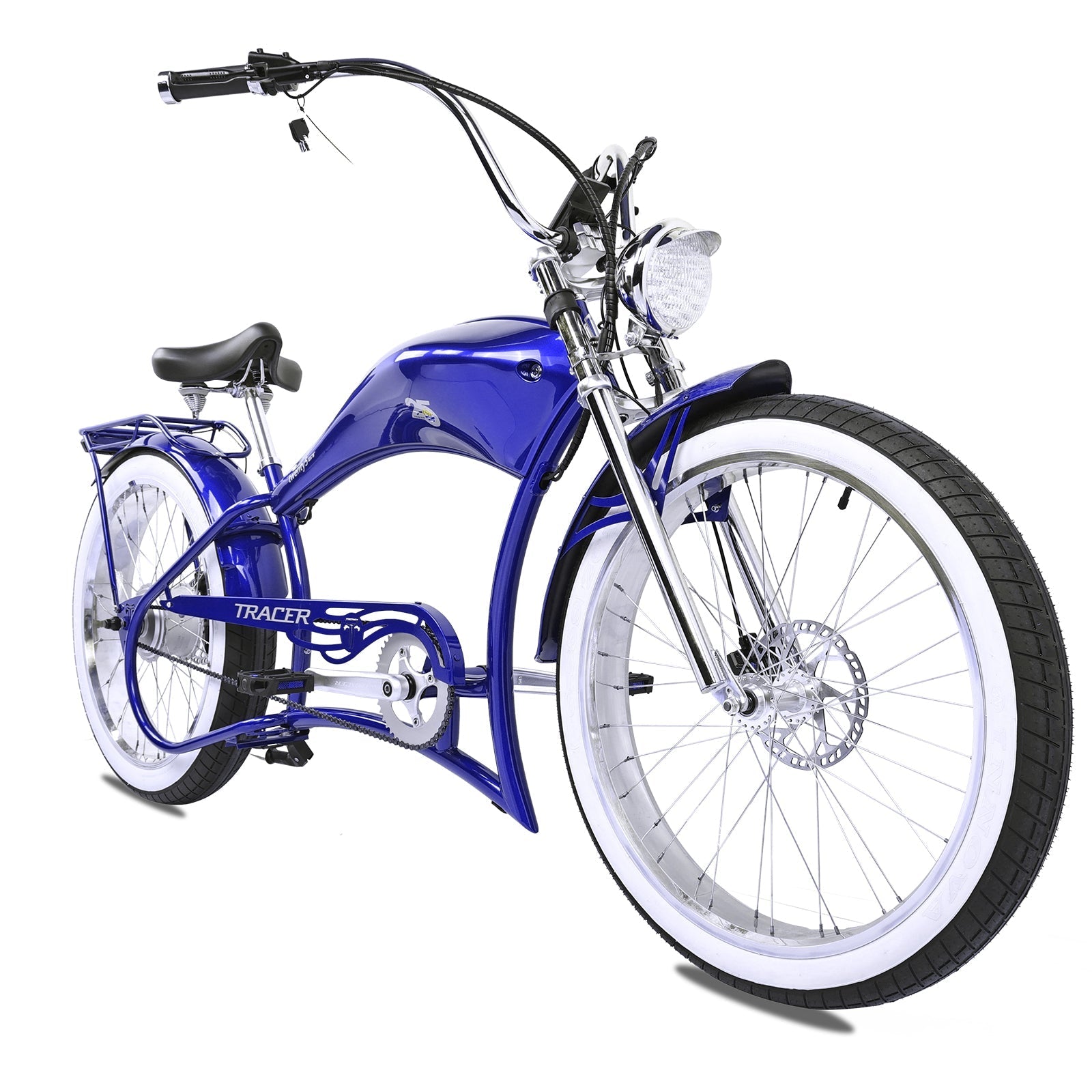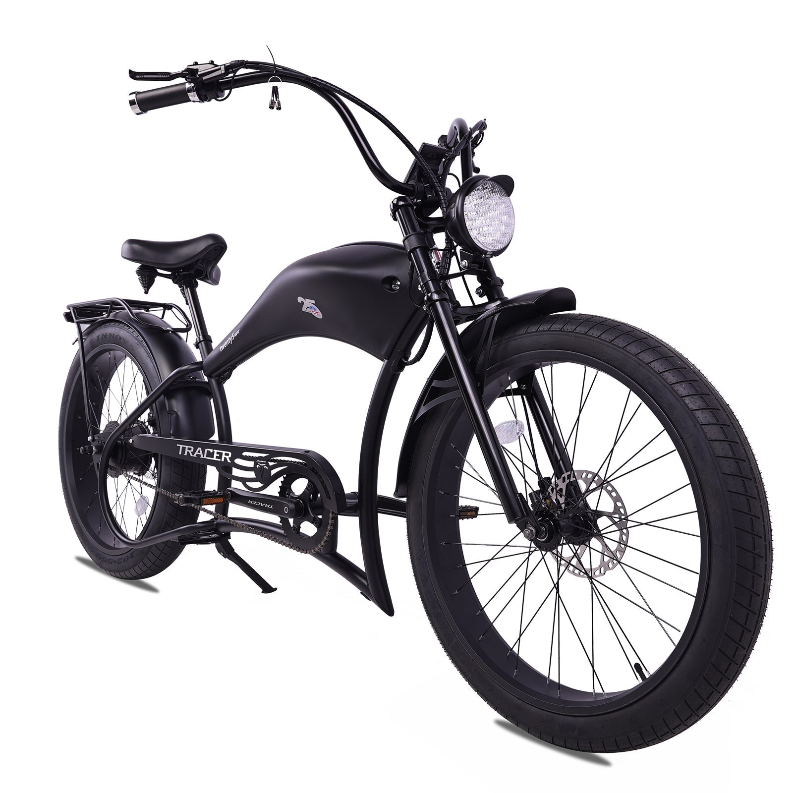 The Tracer 800W Twenty5 is a 26" chopper-style electric cruiser bike featuring an 800W motor, a high-capacity battery, and a stylish, durable frame. It’s designed for riders looking for a powerful and comfortable ride with a unique, retro flair.