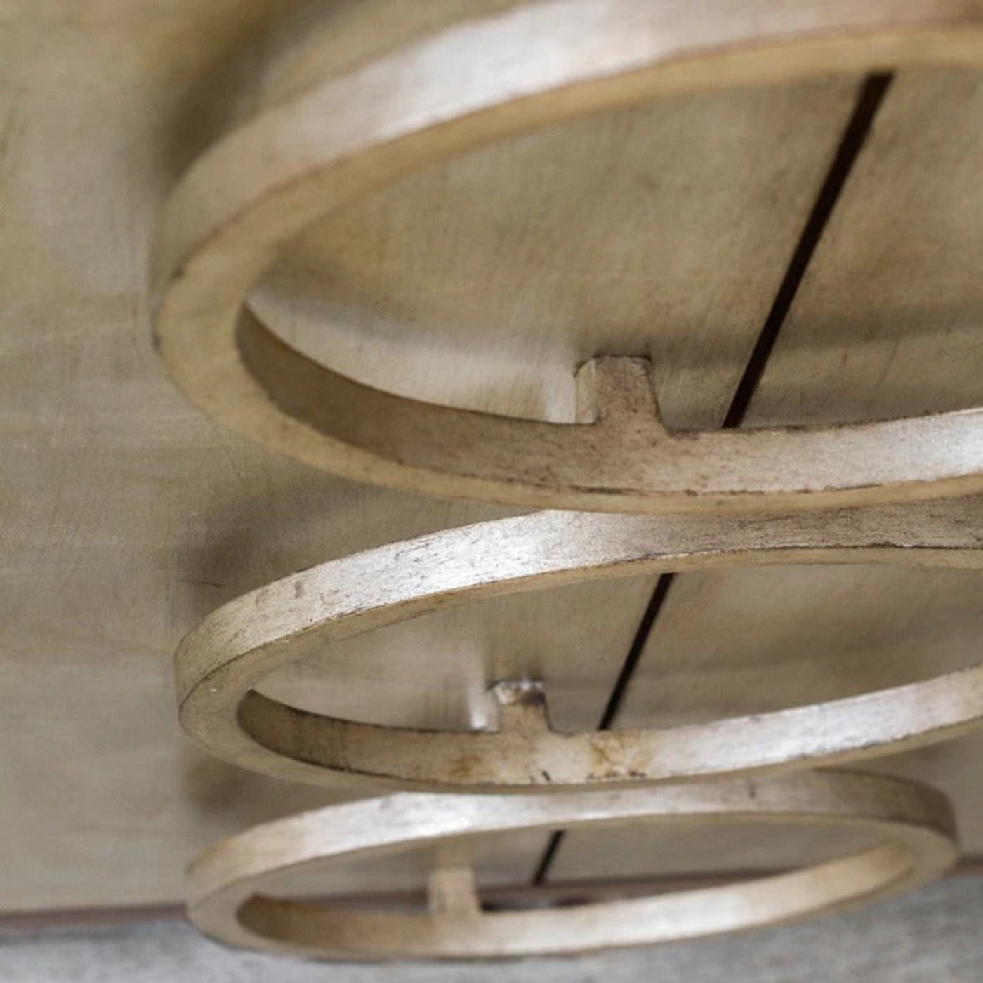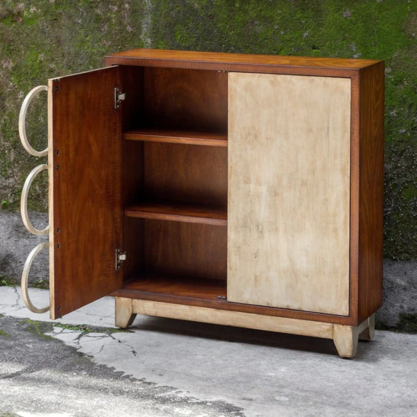 A: A two-door accent cabinet with a dark honey wood frame, silver-leaf doors, and iron ring pulls, offering stylish and practical storage.