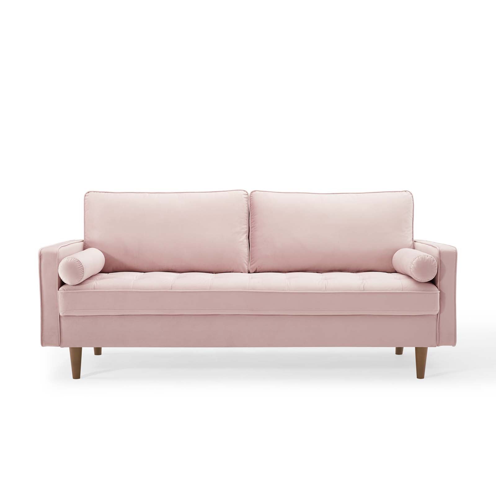 The Modway Valour Sofa is a mid-century modern-inspired piece that combines style and comfort. Upholstered in stain-resistant performance velvet, it features elegant biscuit tufting, a tailored profile, and walnut-stained wood legs, making it a sophisticated addition to any living space.