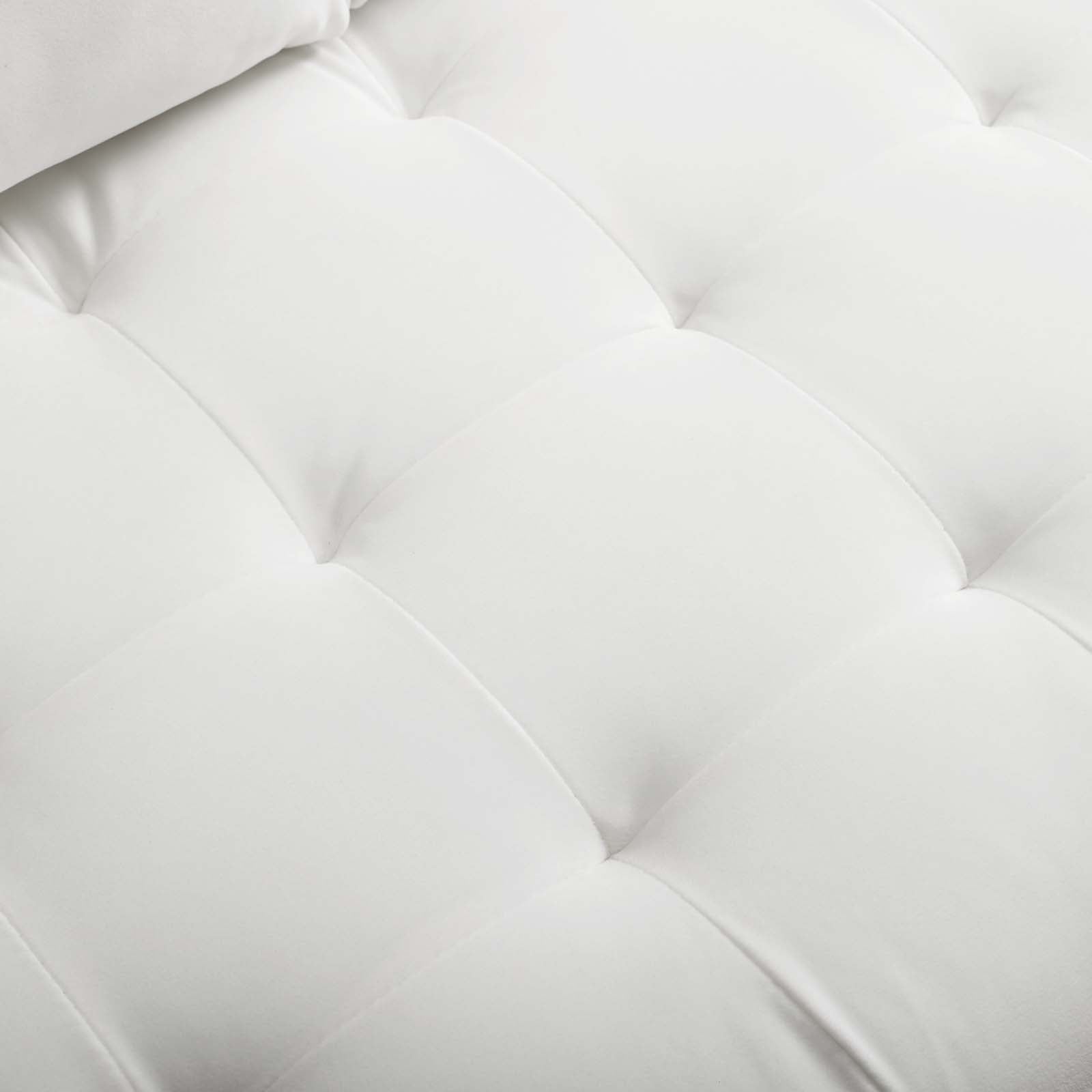 The Modway Valour Performance Velvet Sofa showcases a sleek mid-century modern aesthetic with its clean lines, tufted back, and tapered wooden legs, making it a stylish addition to contemporary living spaces.
