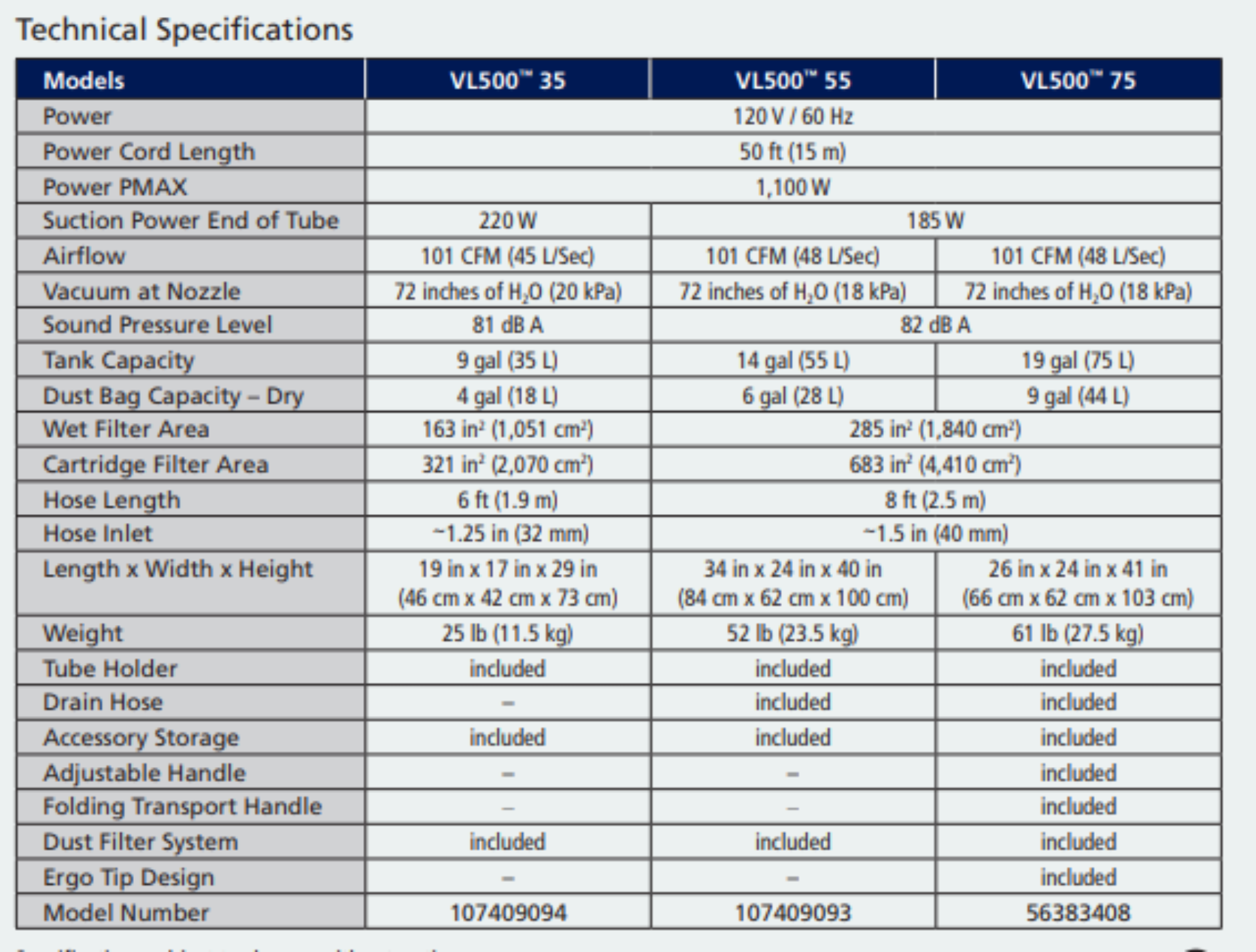 A: The VL500 stands out due to its powerful suction, multiple capacity options, and the included tool kit, providing an efficient and flexible solution for wet and dry vacuuming in commercial environments.