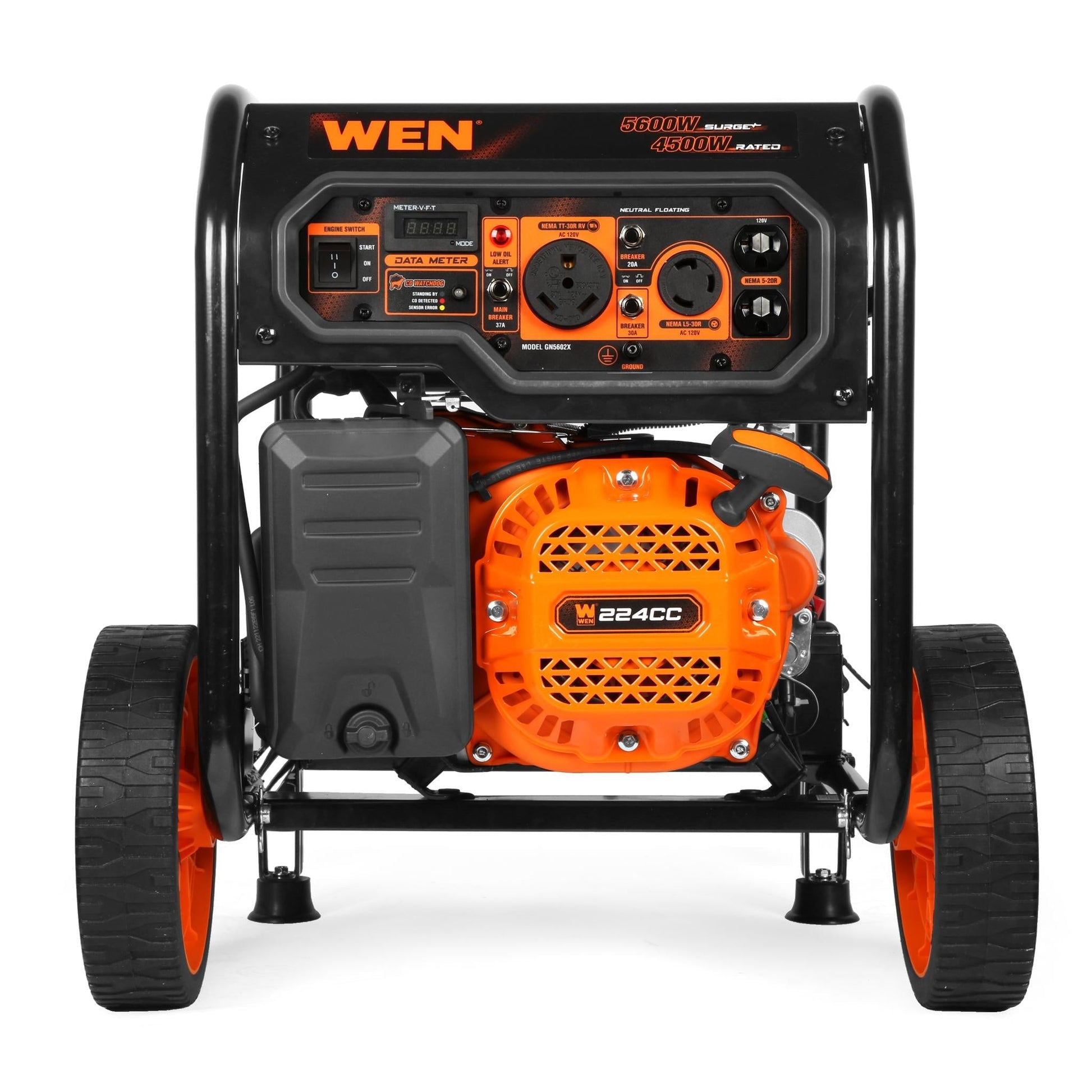 Remember when you kept the lights on? Whether we're providing your home electricity during a crisis or charging your family's cellphones at the campgrounds, WEN has been reliably lighting up lives since 1951. With 5600 starting watts and 4500 running watts, the WEN RV and Transfer-Switch-Ready Electric Start Portable Generator is durable enough for the jobsite and compact enough for easy transport. Run your lights, TV, refrigerator, sump pump, heating, air conditioning, microwaves, power tools, and other essentials with ease. Electric start provides quick ignition with a backup recoil starter if needed. The fully packed panel comes equipped with one RV-ready 30-amp TT-30R outlet, one transfer-switch-ready 30-amp 120V L5-30R outlet, and two standard 120V 20-amp 5-20R outlets. The WEN Watchdog CO Shutdown Sensor helps protect both you and your family by automatically turning off the generator if dangerous levels of carbon monoxide are detected. The wheel and handle kit makes transportation easier than ever while the 4.3-gallon gas tank provides up to 12.5 hours of half-load run time. The onboard data meter digitally displays voltage, frequency, total runtime, and session runtime. And because it’s a WEN product, your generator comes backed by a nationwide network of skilled service technicians, a friendly customer support phone line, and a three-year limited warranty. Remember when you didn’t have to worry about the power going out? Remember WEN.
