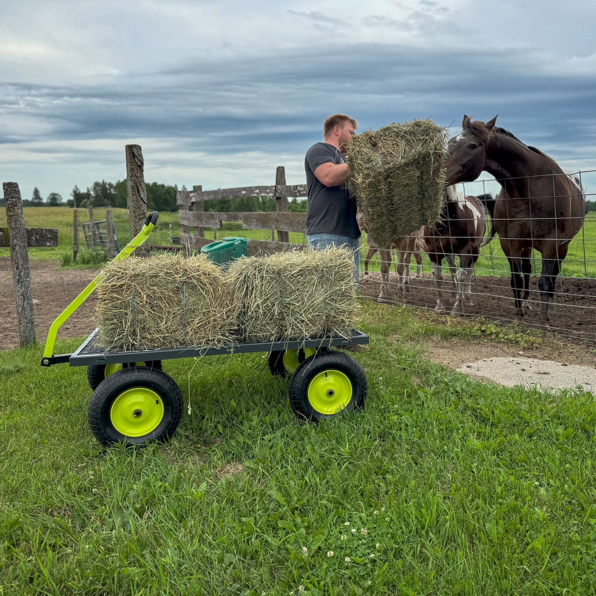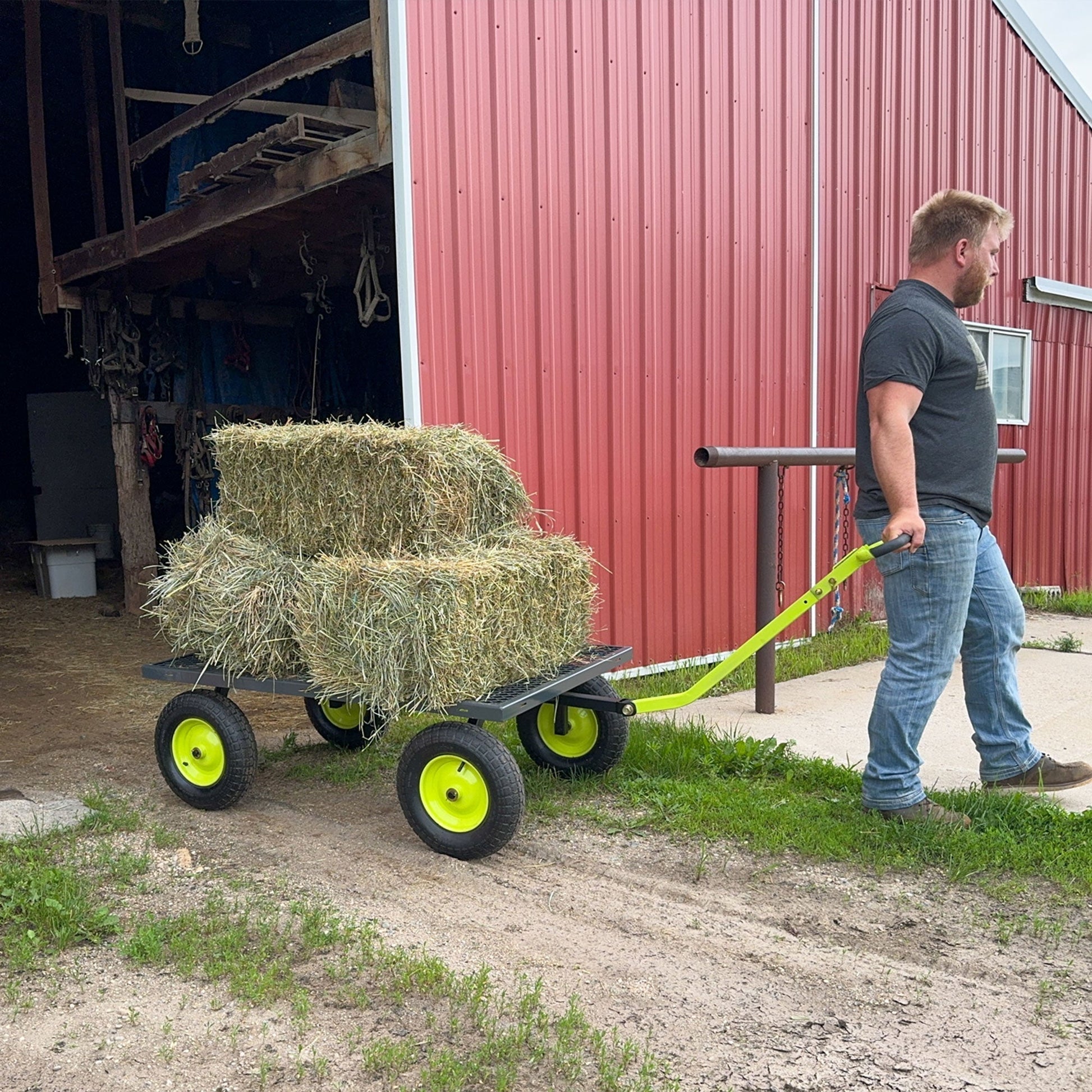 The wagon features a spacious 34 x 52-inch mesh deck constructed from heavy-duty steel, ensuring it stands up to the toughest wear and tear. The 12-inch deep sides are equipped with easy-release latches, allowing them to fold down effortlessly for versatile hauling options and easy portability. Complemented by robust running gear, the reliable design of this jumbo wagon is made from solid steel that offers unmatched durability for lasting use.