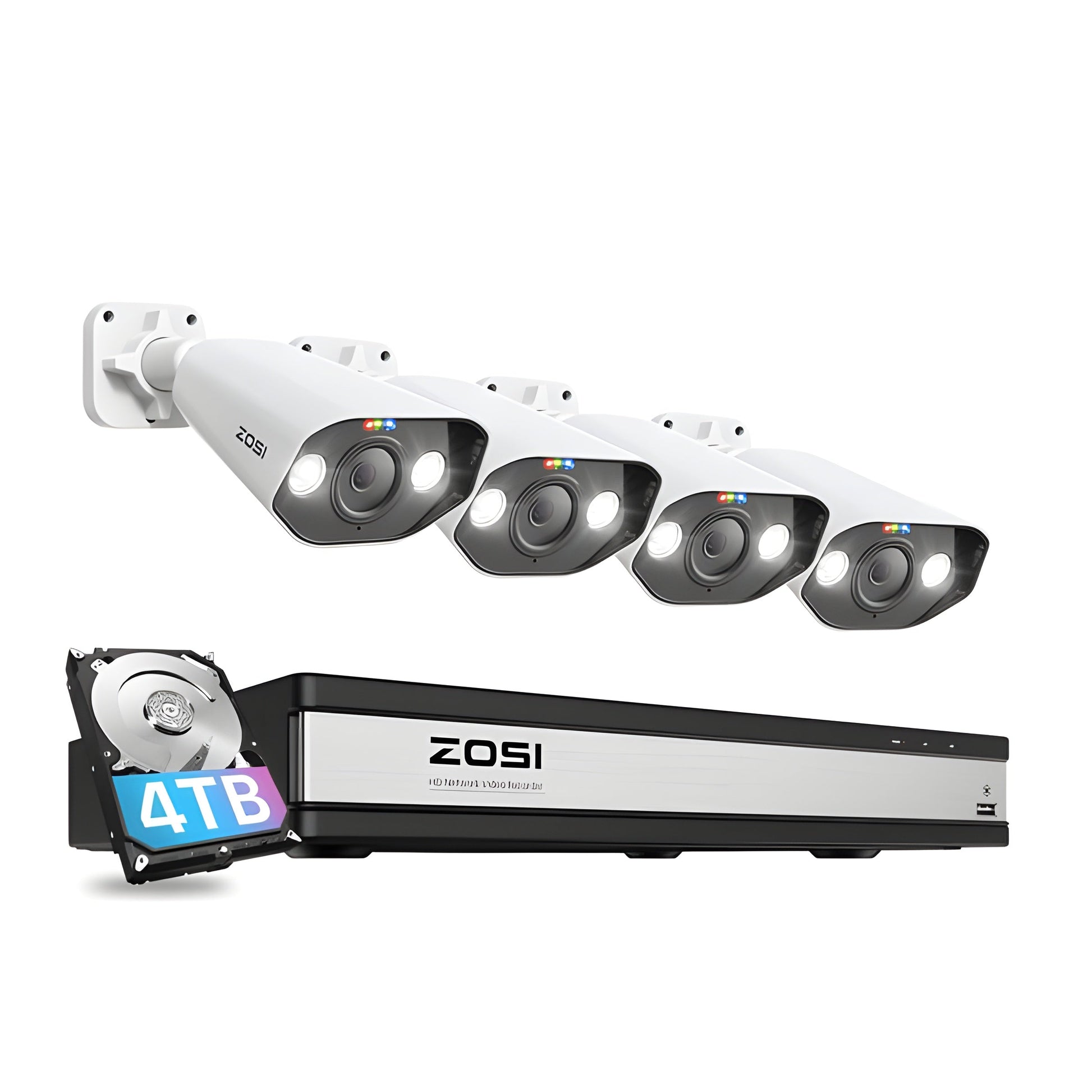 A: The Zosi C182 4K 16CH security system includes four ultra-HD 4K cameras with built-in spotlights, a 16-channel PoE NVR, and a pre-installed 4TB hard drive. It offers AI motion detection, color night vision, remote access, and IP66 weatherproofing for reliable indoor and outdoor surveillance.